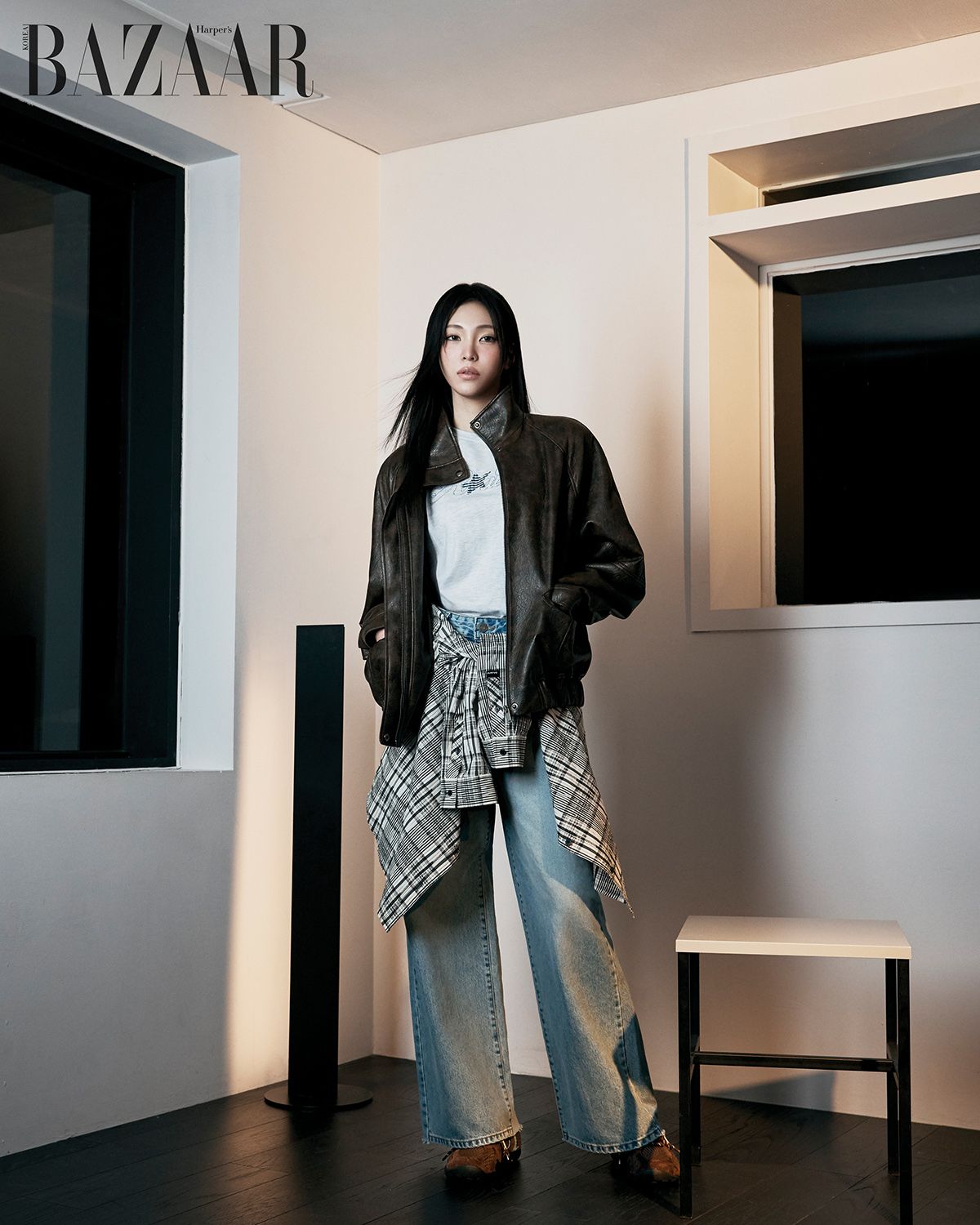 하이넥 블루종 재킷은 25만원대, 티셔츠는 5만원대, 데님 팬츠는 13만원대, 허리에 두른 체크 셔츠는 12만원대, 메시 스니커즈는 12만원대 모두 Raive.