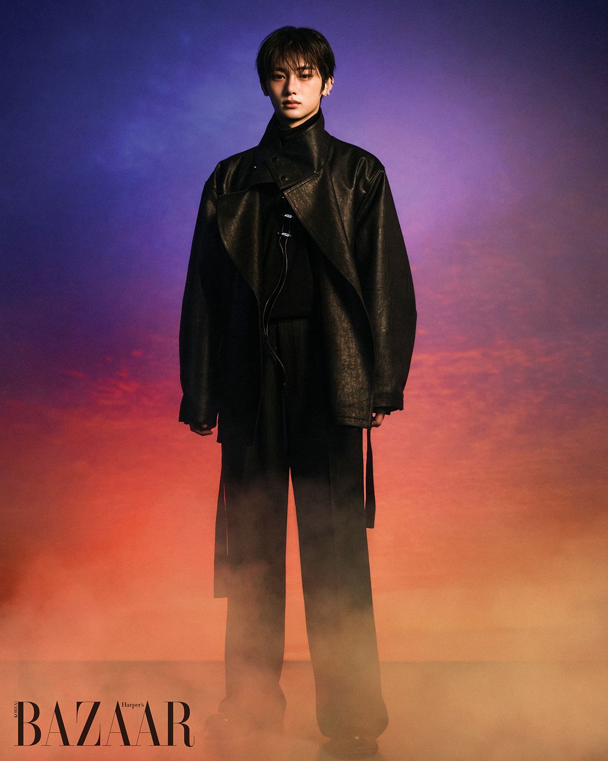 가죽 재킷, 터틀넥 톱, 팬츠, 이어커프, 목걸이는 모두 Re Rhee. 슈즈는 스타일리스트 소장품.