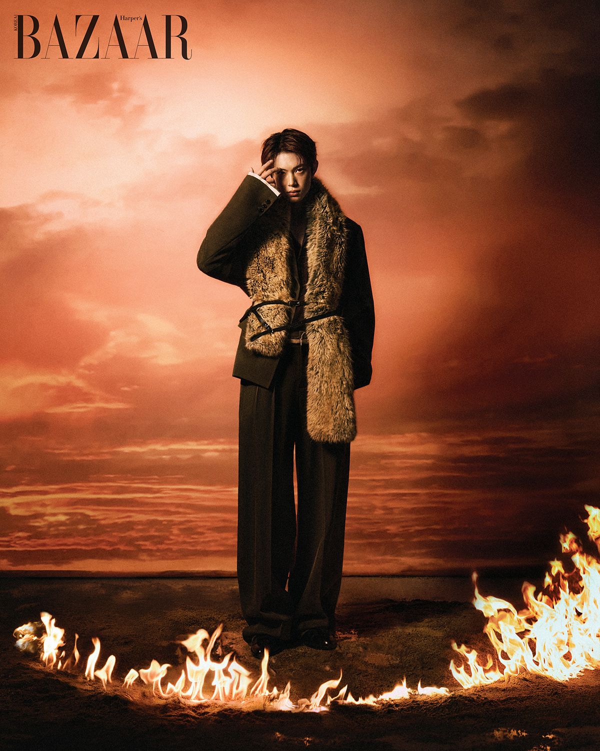 울 재킷, 셔츠, 울 팬츠, 퍼 머플러, 벨트는 모두 Re Rhee. 슈즈는 스타일리스트 소장품.