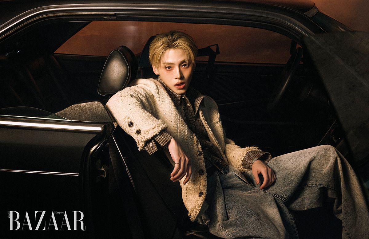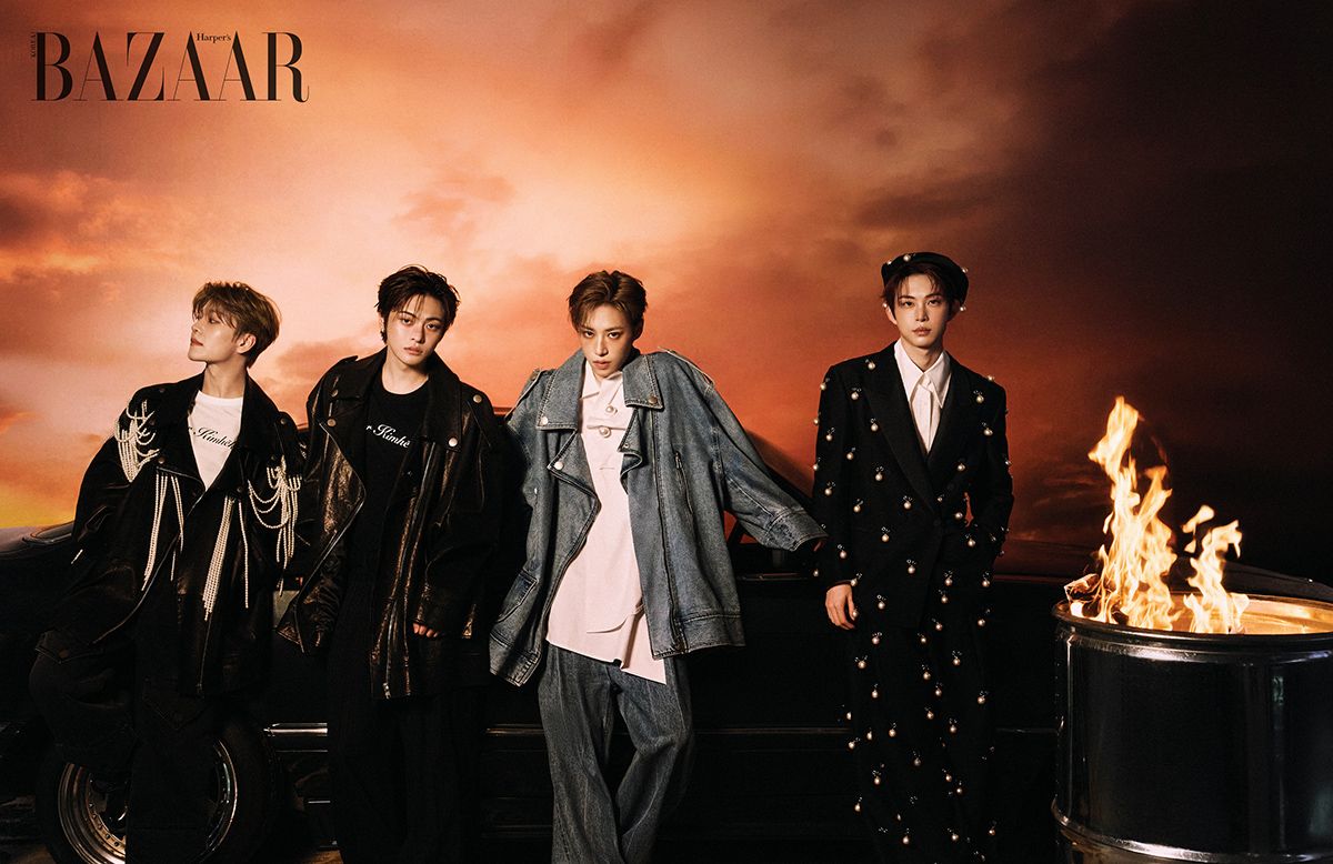 (왼쪽부터) 씬롱이 착용한 진주 장식 라이더 재킷, 티셔츠, 팬츠, 앵클부츠, 리오가 착용한 오버사이즈 라이더 재킷, 티셔츠, 팬츠, 아르노가 착용한 데님 라이더 재킷, 셔츠, 데님 팬츠, 건우가 착용한 진주 장식 재킷, 셔츠, 팬츠, 베레는 모두 Kimhēkim. 귀고리는 스타일리스트 소장품.