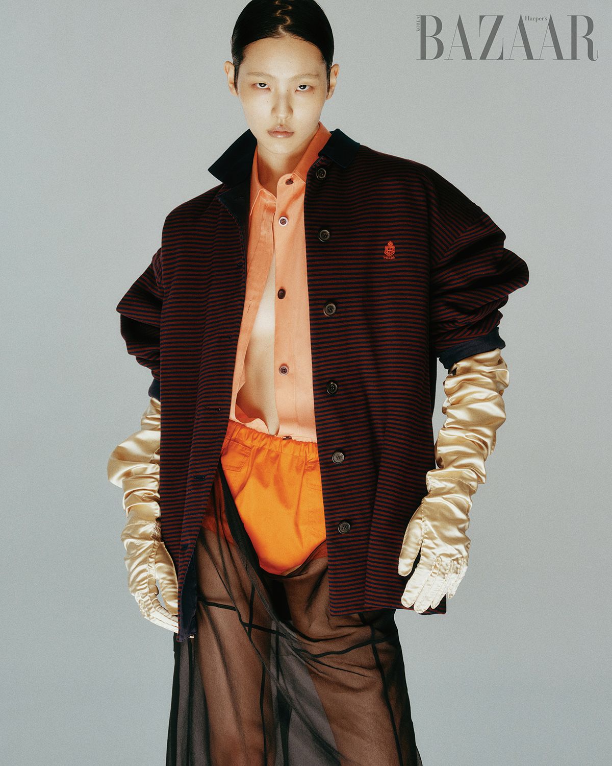 피케 셔츠 겸 재킷, 포플린 셔츠, 서스펜더 스커트, 브리프, 장갑은 모두 Prada.