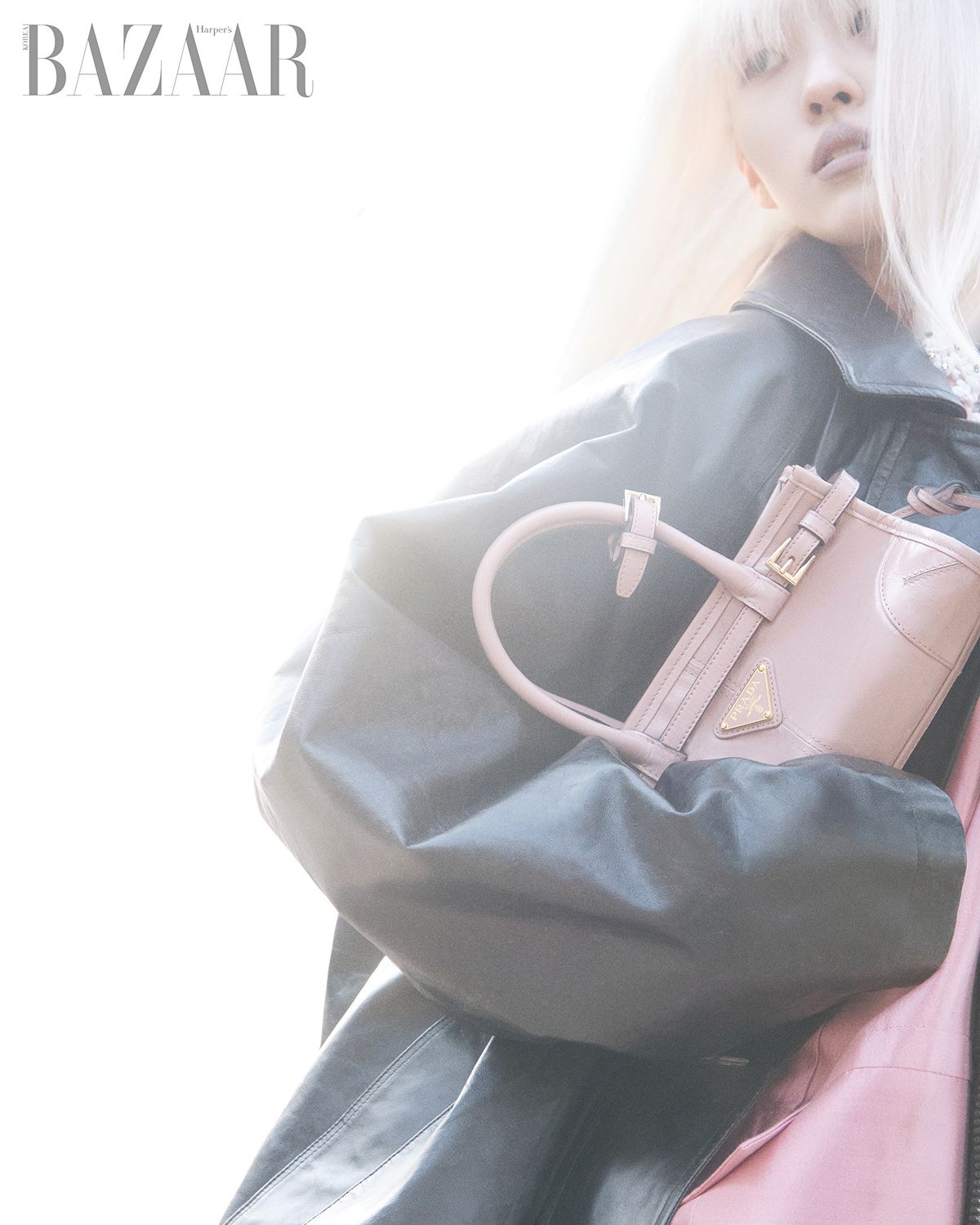 레더 재킷, 드레스, ‘보니’ 미니 핸들 백은 모두 Prada.