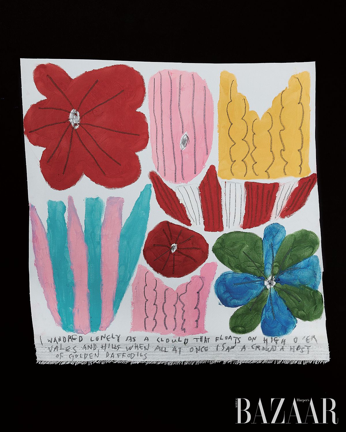 유화 작업을 이어온 작가 김참새에게 이번 프로젝트는 익숙하지만 새로운 확장이었다. 메이크업포에버 섀도 등을 으깨자 오일 파스텔과 닮은 물성이 드러났다. “붓을 사용하지 않는데 화장품은 오일 함량이 더 많아 손이 자유자재로 움직이더라고요. 독성이 없고 향기도 나고요.” 변화를 모색하기보다 화장품을 자신의 재료로 만드는 데 집중했다. 봄의 다양한 얼굴을 보여주기 위해 제품 컬러를 선별했고, 색의 균형을 조율하는 과정에도 많은 시간을 할애했다. “하단에 적은 문구는 윌리엄 워즈워스(William Wordsworth)의 시 ‘수선화’ 일부예요. 이 시는 단순히 꽃을 묘사한 것이 아니라, 자연이 인간의 내면을 치유하는 방식을 말하죠. 이번 그림 주제와 잘 맞는 것 같아 몇 구절을 적게 되었어요.”