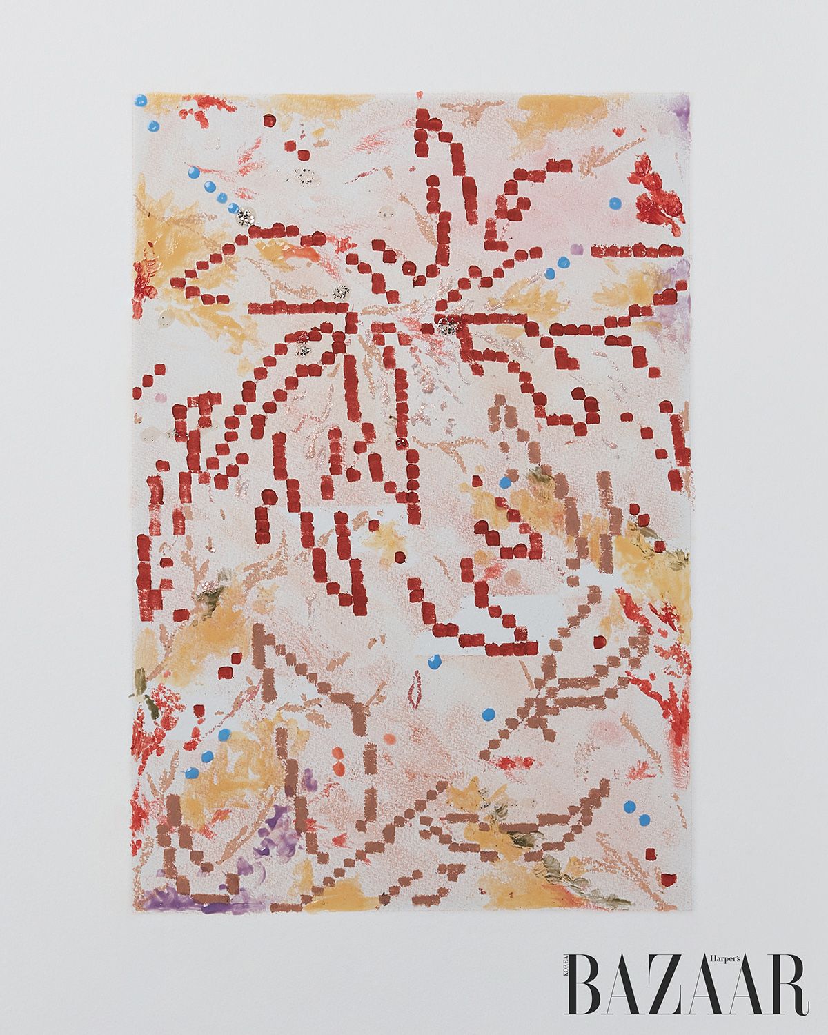 운동감 있는 붓질과 정적인 픽셀 드로잉, 그 충돌을 한 화면에 담는 작업을 즐기는 작가 금소현. 이번에는 한정된 색감 안에서 서로 다른 텍스처를 활용해 대비의 흐름을 확장했다. 에스쁘아, 구찌 등의 섀도와 치크 파우더를 베이스로 얹고 겔랑, 맥, 글린트 등의 리퀴드 립과 네일 폴리시, 글리터로 층을 쌓았다. “쉽게 사라지는 순간을 박제하고자 하는 작업이 많아요. 봄의 따스한 공기와 햇살, 꽃잎이 떨어지는 찬란한 순간을 포착했어요.” 연한 색 배경 위에 흩날리는 꽃잎을 불꽃처럼 배치해 경쾌함을 강조했다.
