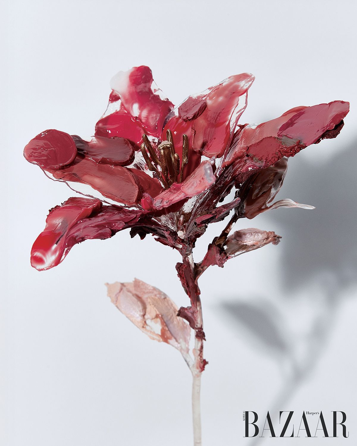 자연물을 수집해 레진과 같은 인공적 소재로 치환해온 작가 장혜경. 그가 만든 레진 꽃 위에 서로 다른 텍스처를 겹쳐 올려 또 하나의 조형을 만들었다. 자연을 수집하고 재구성하는 <Souvenir> 시리즈의 연장선이다. 꽃잎에는 힌스 듀이 볼 등의 촉촉한 질감을, 잎과 줄기에는 나스 립스틱 등의 거친 제형을 사용해 상반된 물성이 공존하도록 했다. “대비되는 성질이 하나의 개체 안에 놓일 때 발생하는 아이러니와 몽환성을 좋아해요. 나라는 사람과 결이 같죠. 화장품을 재료로 바라본 적이 없었는데 그 디테일에 놀랐어요. 용기는 물론 제형이나 컬러가 정말 다양하더라고요.”