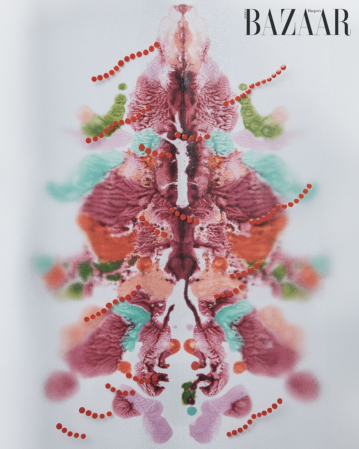 겉으로는 고요하지만, 내부에서는 이미 감정이 팽창하고 있는 상태를 다룬다. “그 미세한 긴장을 ‘조용한 폭발’이라고 부르고 싶었어요. 봄은 완전히 피어난 장면이 아닌, 안에서부터 차오르다 막 터지기 직전의 시간에 가까워요. 개화의 결과가 아닌, 개화 직전의 긴장감에 머물러 있는 작업입니다.” 작가 리리리는 이런 통제되지 않는 감정이 데칼코마니와 닮아 있다고 생각했다. 똑같이 찍어내지만, 레이어에 따라 어떤 형태가 나올지 쉽게 예측할 수 없는. 코팅된 종이 위에 립과 틴트, 네일 폴리시 등을 좌우로 겹쳐 찍어내며 통제와 우연 사이의 긴장을 시각화했다. 우연적이지만, 지나치게 즉흥적으로 보이지 않도록 색 배합을 세심하게 조율했다. 투명지 위에 더한 도트는 그의 작업 세계를 상징하는 요소다. “작은 원은 제 감정의 최소 단위예요.”