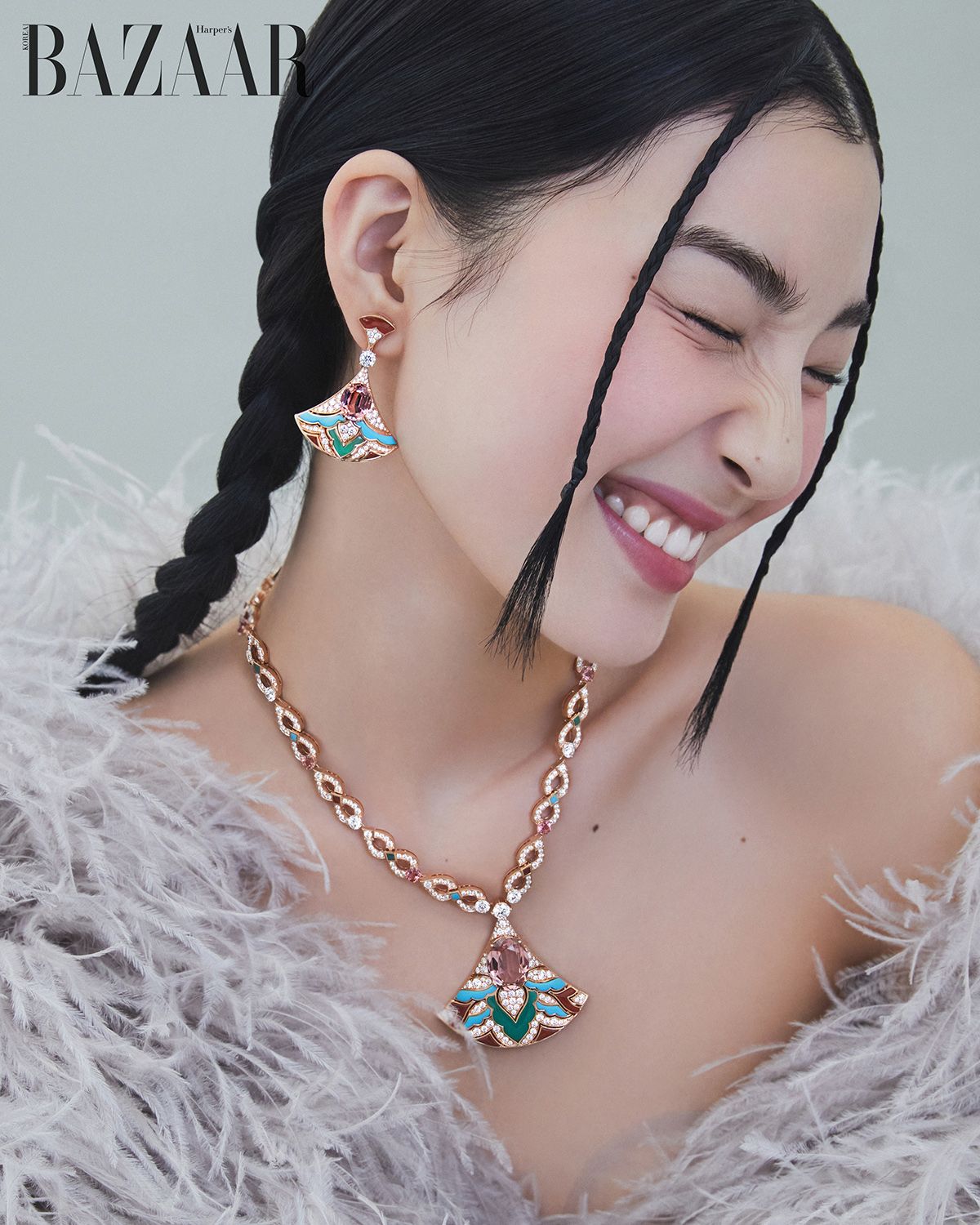 로즈 골드 소재에 다이아몬드, 크리소프레이즈, 카닐리언, 튀르쿠아즈를 장식한 ‘디바스 드림’ 하이주얼리 이어링, 네크리스는 Bvlgari.