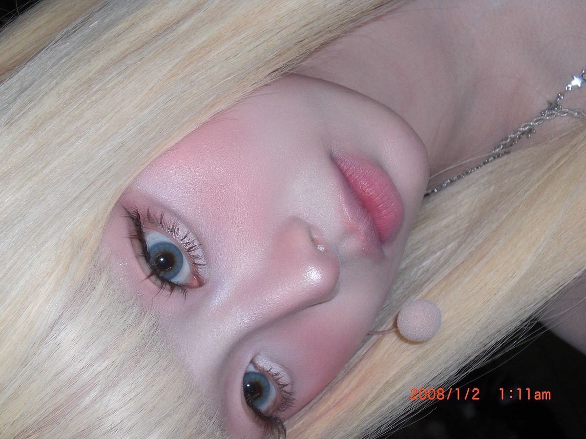 무대와 일상에서 모두 블루 렌즈를 활용하는 리즈. 무대용 메이크업에서는 언더 마스카라와 짙은 섀도로 눈매를 또렷하게 잡고, 로즈 톤 블러셔와 립으로 온도를 더했다. 선명한 아이 메이크업과 차가운 렌즈 컬러의 대비가 인상적이다.