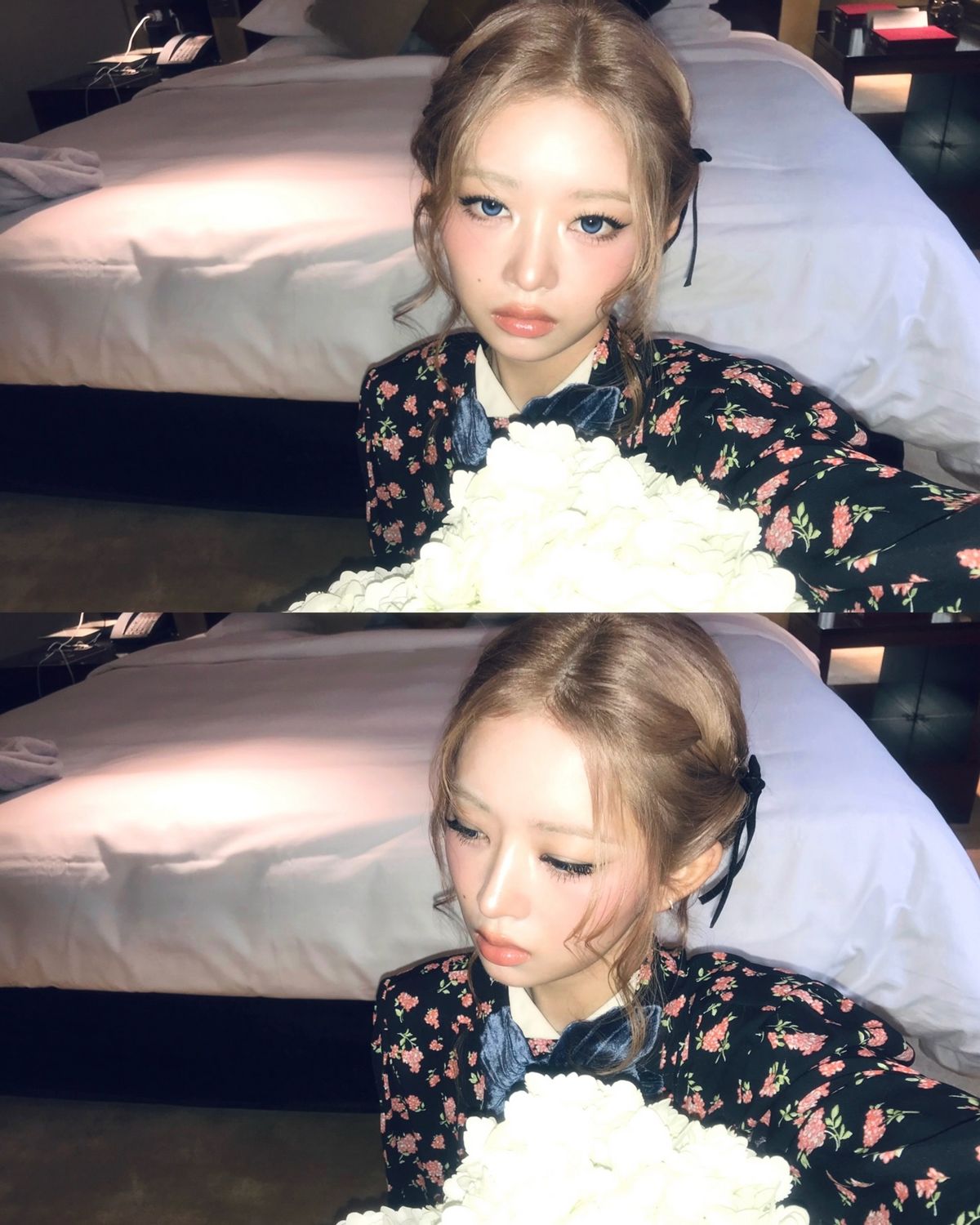 블루 렌즈를 착용한 또 다른 날의 레이는 완전히 다른 무드를 자아낸다. 리본을 활용해 올린 머리와 영롱한 블루 렌즈, 룩의 플라워 패턴과 톤을 맞춘 살굿빛 립과 블러셔가 빈티지 로맨틱 무드를 연출했다.