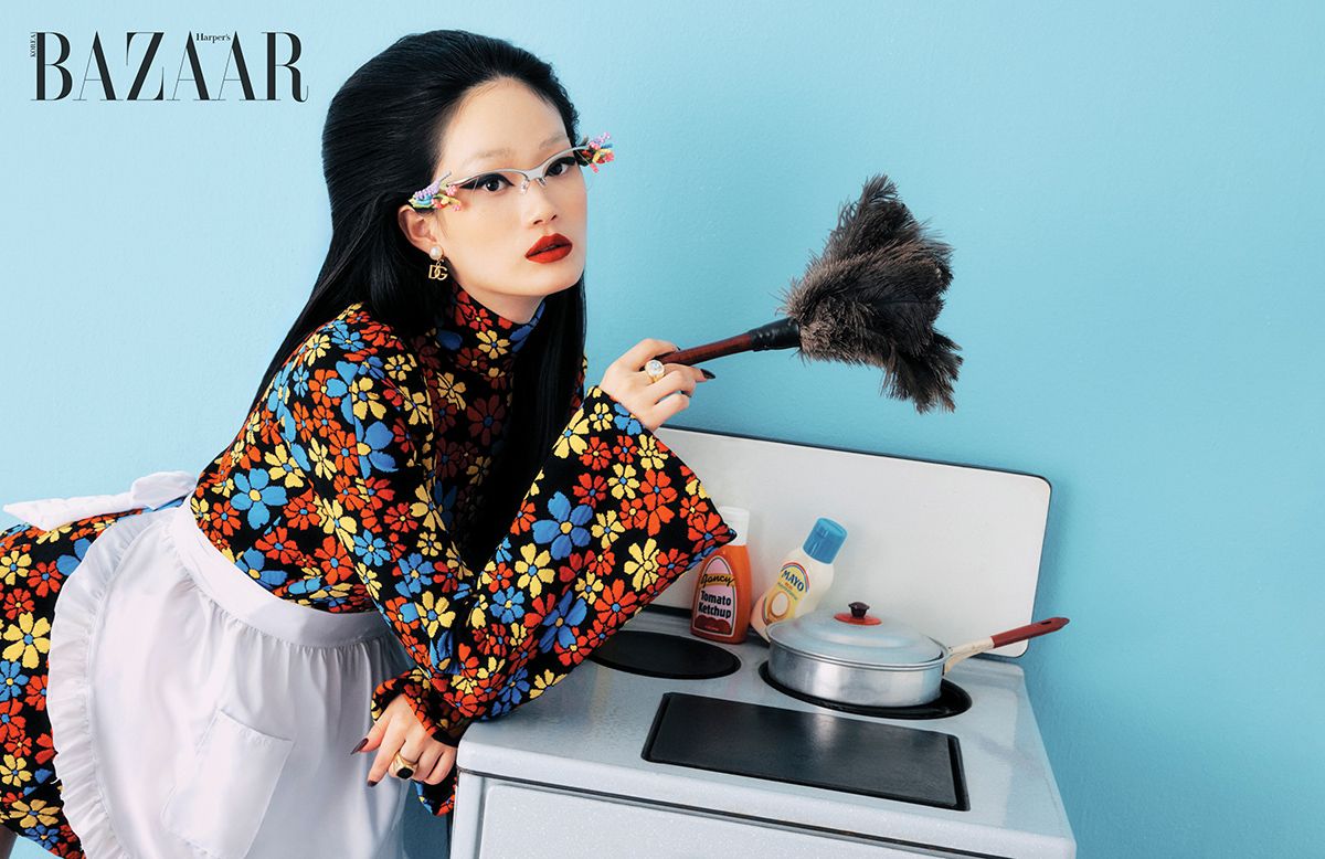 플로럴 자수 드레스는 Celine. 플라워 비즈 장식 안경은 40만원 Gentle Monster. 드롭 귀고리는 Dolce & Gabbana. 오른손 중지에 착용한 반지는 24만9천원 Swarovski. 왼손 중지에 착용한 반지는 Gucci. 허리에 묶은 앞치마는 에디터 소장품.