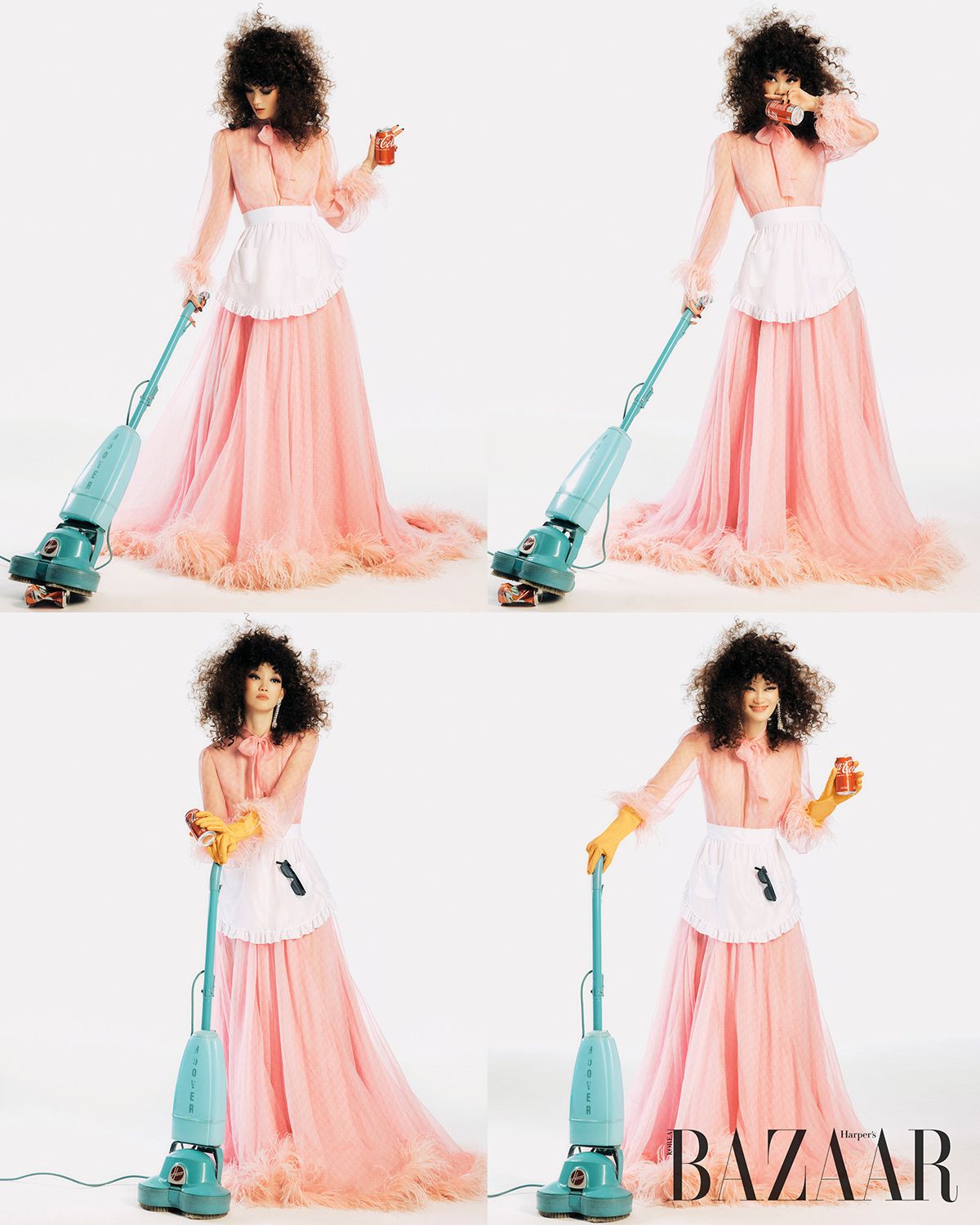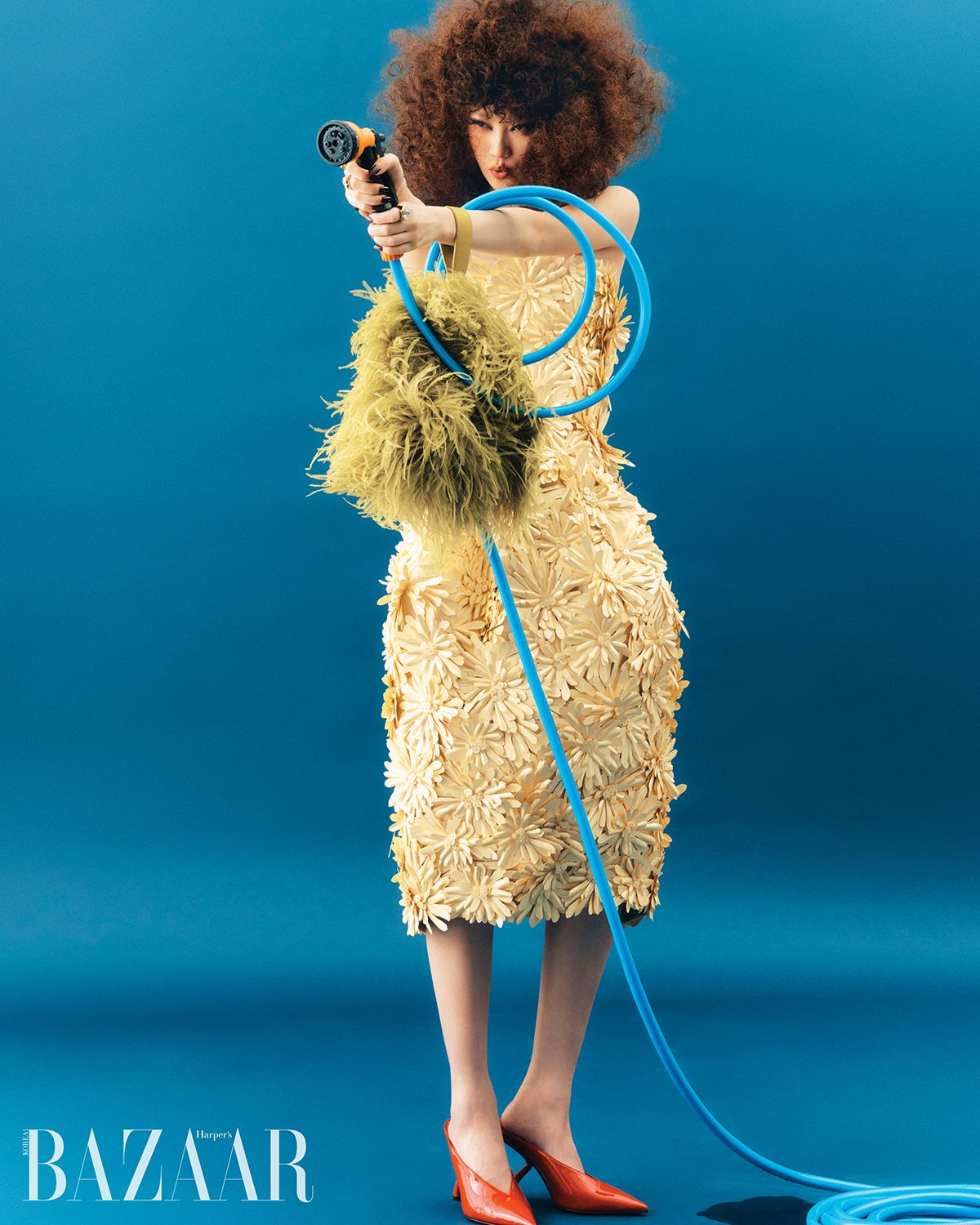 페더 디테일 맥시 드레스, 크리스털 귀고리는 Gucci. 주머니에 넣은 선글라스는 Chanel. 허리에 묶은 앞치마는 에디터 소장품.