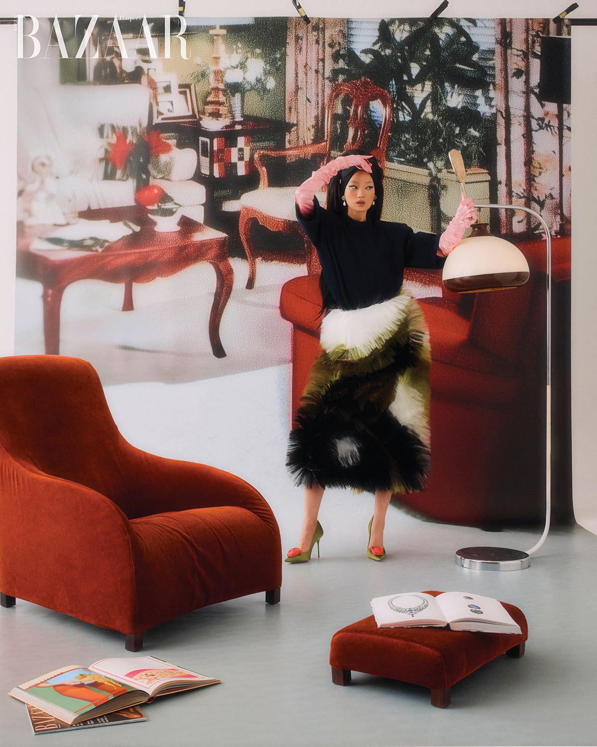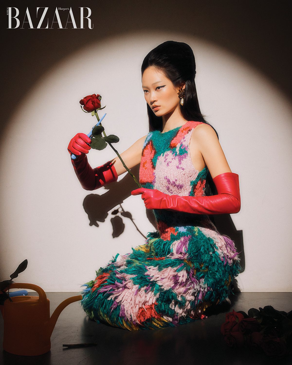 니트 톱, 프린지 스커트는 Bottega Veneta. 귀고리는 Dolce & Gabbana. 플라워 장식 헤드밴드, 펌프스는 Roger Vivier. 새틴 장갑은 Prada.