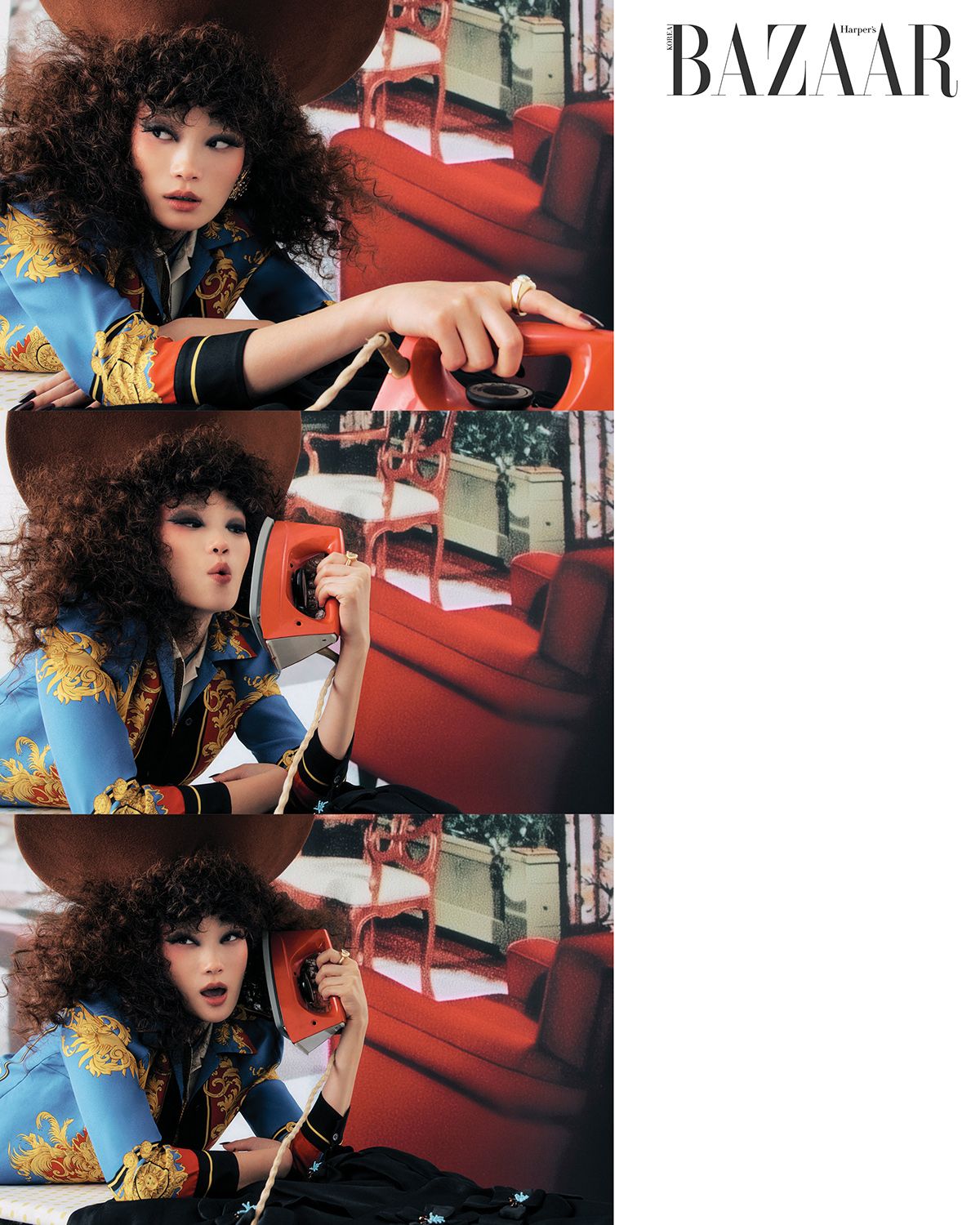 프린트 셔츠, 레이어드한 셔츠, 이너로 착용한 니트 톱은 모두 Versace. 오버사이즈 펠트 모자는 Loro Piana. 귀고리는 Chanel. 왼손 검지에 착용한 반지는 Dior. 오른손 검지에 착용한 반지는 24만9천원 Swarovski. 다리미판 위에 놓인 미니 드레스는 Shushu/Tong.