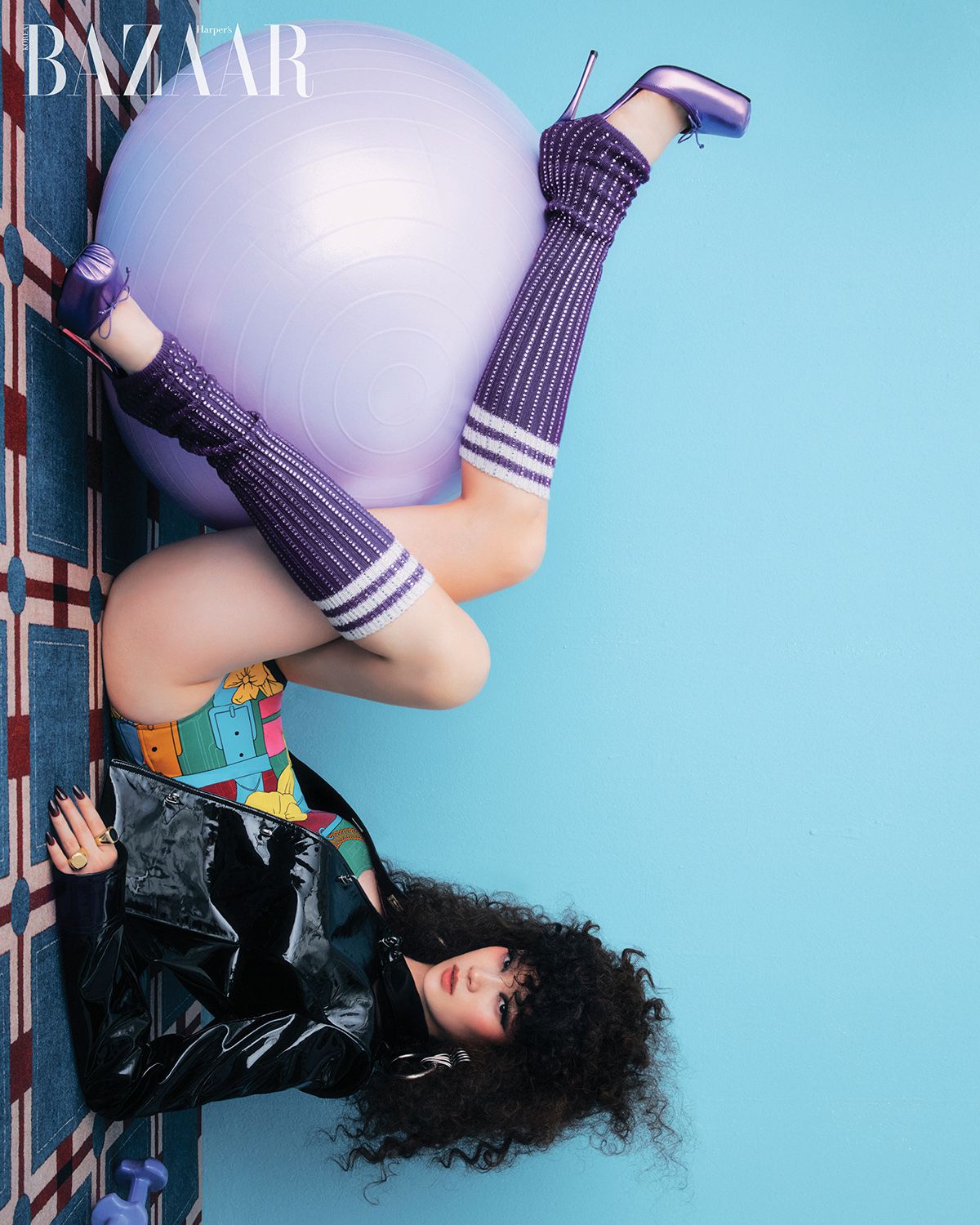 페이턴트 레더 재킷은 Ferragamo. 스윔웨어는 Hermès. 링 귀고리는 Versace. 왼손 검지와 약지에 착용한 반지는 Gucci. 레그워머 디테일 스틸레토 힐은 Christian Louboutin.
