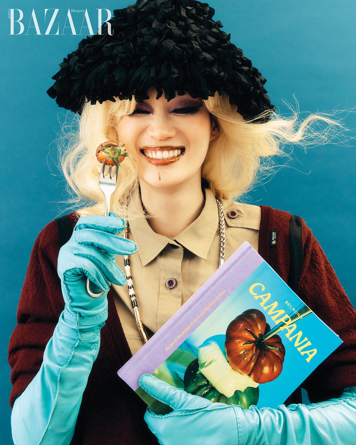 니트 톱, 셔츠, 레더 장갑은 모두 Prada. 프린지 디테일 모자는 Loro Piana. 목걸이는 Chanel. 디너 포크는 Hermès.