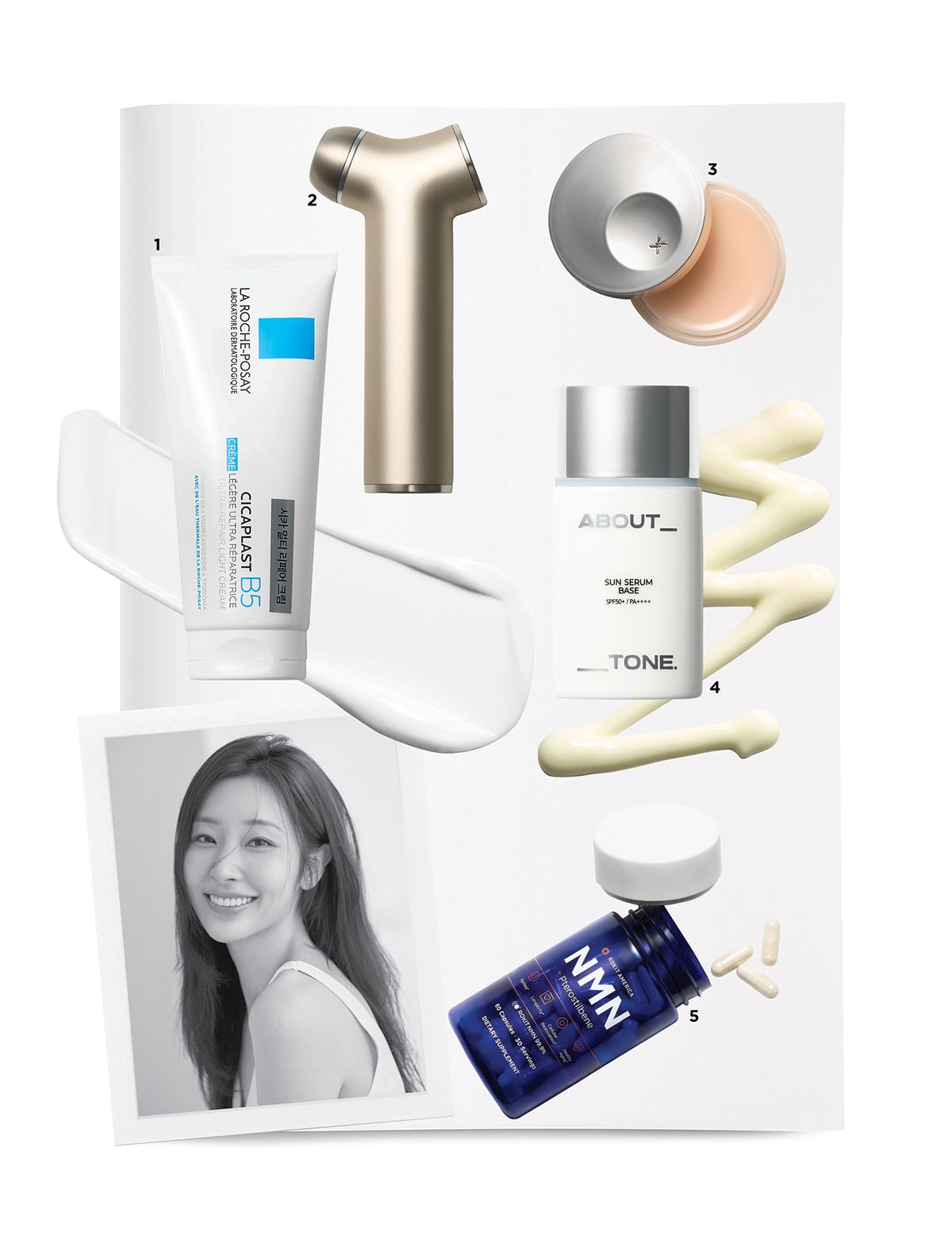 1 La Roche Posay 시카플라스트 멀티 리페어 크림 5만원. 2 Quadthera 티탄 1백48만원. 3 Xoul 에버 모이스트 볼륨 립밤 2만6천원. 4 About Tone 선 세럼 베이스 SPF50+/PA++++ 1만8천원. 5 Rokit America NMN 프테로스틸벤 7만5천원대.