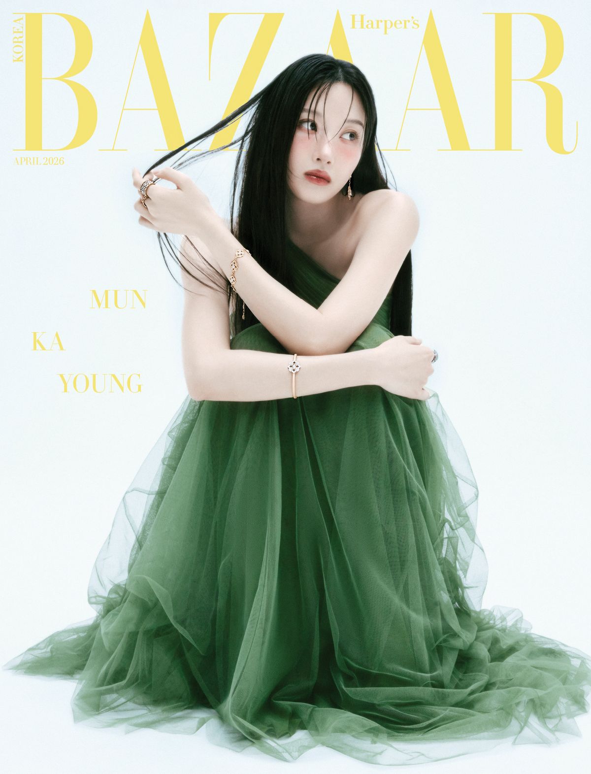 요정을 연상케 하는 청초함과 싱그러움, 여신의 우아함과 고혹미가 공존하는 커버다. 13일에 공개된 2개의 커버 및 1개의 인사이드 커버 속에서 문가영은 그린과 화이트 컬러의 드레스에 섬세한 하이주얼리를 다채롭게 스타일링했다. 화보의 콘셉트는 ‘A Forest Fairy’. 4월호에 걸맞은 숲의 요정을 모티프로 문가영의 순수한 아름다움을 포착했다. 이슬을 머금은 초록빛 숲과 정원, 흰 꽃들 사이에서 고고하게 모습을 드러낸 그녀의 아우라에 절로 시선이 머문다. 사진 속에서 문가영이 착용한 주얼리는 모두 부첼라티(Buccellati)의 제품으로, 에뚜왈레, 오페라 튤레, 토르세이드 컬렉션을 비롯해 메종의 아이코닉한 피스들을 그녀만의 감성으로 소화한 것이 돋보인다.