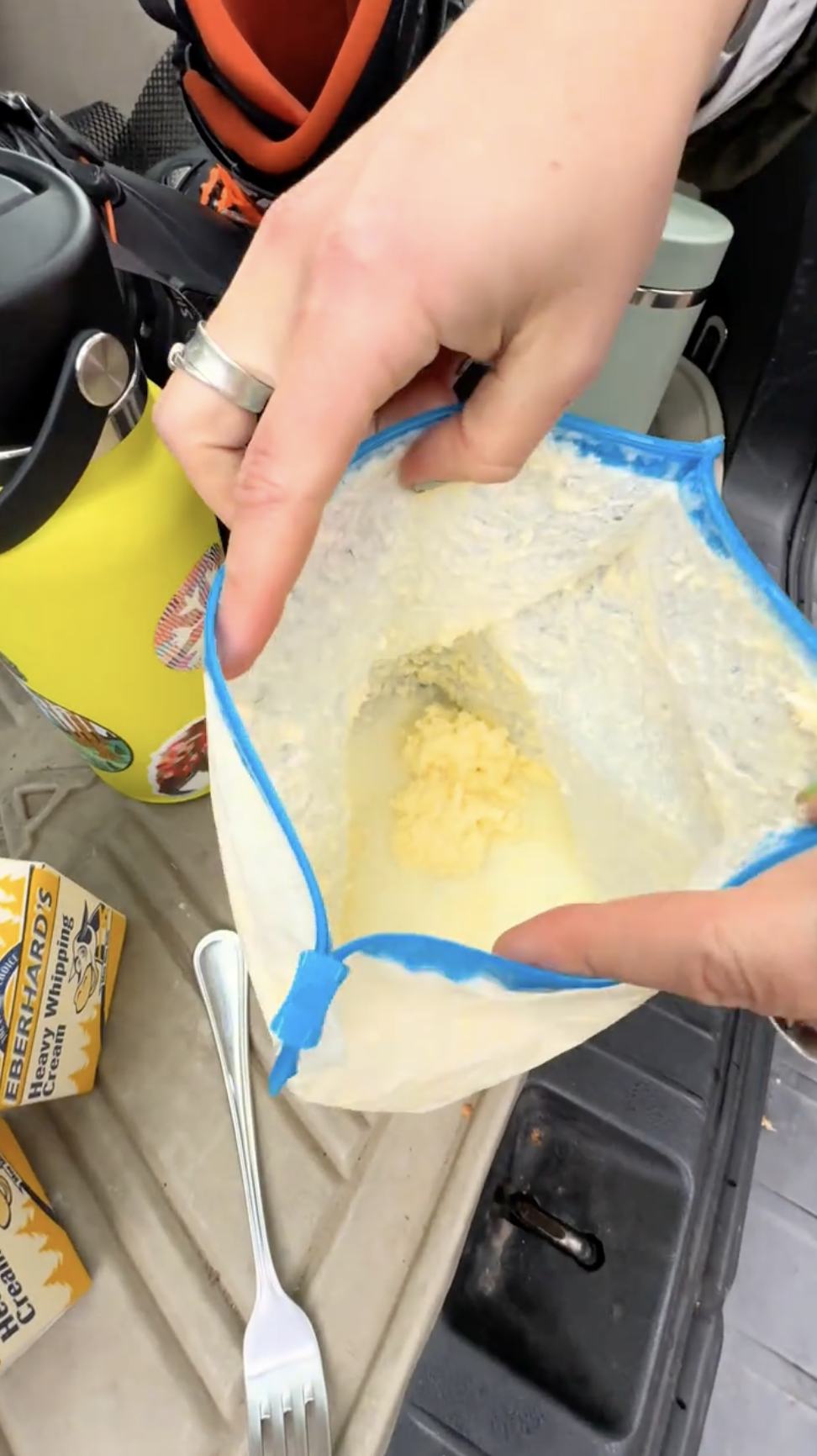 준비는 간단하다. 지퍼백에 소금 한 꼬집과 생크림을 약 1/3 정도만 담는다. 흔들릴 공간이 필요하기 때문에 꽉 채우지 않는 것이 포인트. 터질 위험을 줄이기 위해 이중 밀봉을 해주면 더욱 안전하다. 빈 페트병을 활용해도 좋다. 여기서 한 가지 팁. 생크림은 지방 함량 35% 이상의 제품을 선택할 것. 지방 함량이 높을수록 버터가 더 잘 만들어진다.