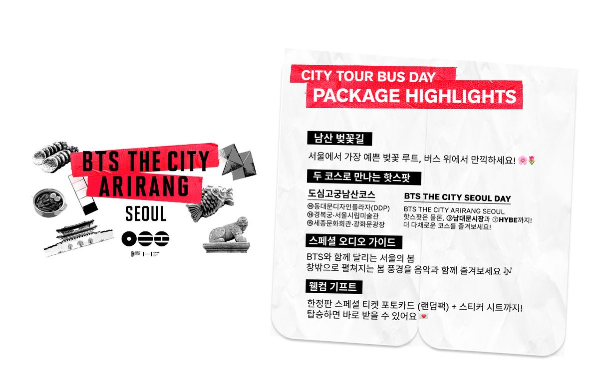 경복궁·DDP 등 명소를 버스로 순환하며 BTS 히트곡과 함께 서울의 봄 풍경을 즐기는 특별한 투어 코스. DAY와 NIGHT, 두 가지 코스를 취향에 따라 선택할 수 있다. DAY 코스에서는 활기 넘치는 서울의 낮을, NIGHT 코스에서는 남산서울타워 야경과 함께 반짝이는 서울의 밤을 만끽할 수 있다.