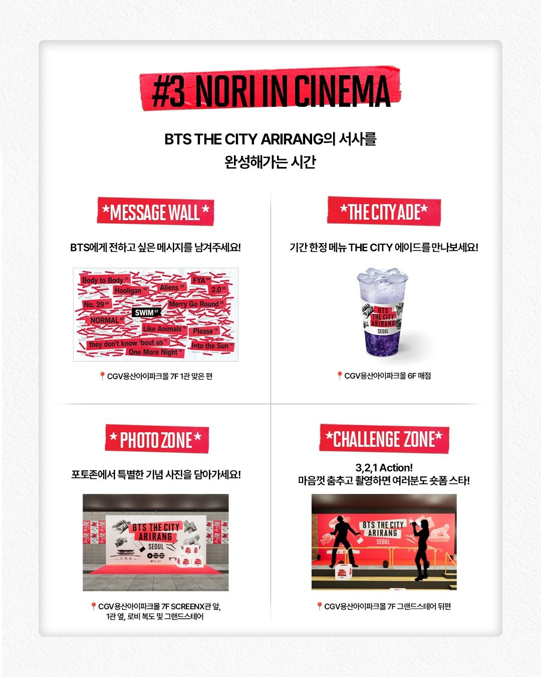 3월 22일 일요일, CGV 용산아이파크몰은 다양한 체험을 즐길 수 있는 공간으로 탈바꿈한다. 전통 놀이를 즐길 수 있는 게임 존과 ‘ARIRANG’ 전곡을 함께 부를 수 있는 노래방 상영회, 포토존까지 극장을 즐길 거리로 가득 채웠다. BTS 컴백의 열기를 온전히 만끽할 수 있는 특별한 여정이 펼쳐진다.