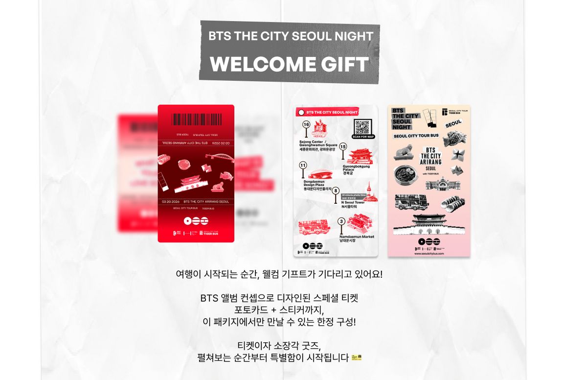컴백의 열기를 이어 서울 전역을 축제의 장으로 만들 <BTS THE CITY ARIRANG SEOUL> 또한 오늘부터 시작된다. 음악과 미디어 아트, 다채로운 체험 공간이 도시와 어우러지는 대규모 프로젝트로, 주요 랜드마크가 앨범 메인 컬러인 붉은 빛으로 물들고 특별한 공간들이 팬들을 맞이한다.