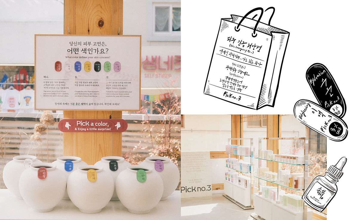 북촌 골목에 자리한 픽넘버쓰리는 피부 고민을 기준으로 제품을 제안하는 뷰티 큐레이션 스토어다. 입구에 들어서면 진정, 수분, 장벽 등 7가지 피부 고민을 담은 항아리가 보이는데 이 중 두개를 고르면 그에 맞는 제품 3가지를 추천해준다. 데이터베이스를 기반으로 한 피부 고민을 약 200개의 세부 토픽으로 나눈 뒤 성분 함량과 사용자 리뷰 등을 통해 최종 선별한 결과다. 추천 받은 제품은 매장 큐레이터의 꼼꼼한 상담으로 다시 한 번 맞춤 검증된다. 2층 브랜드 존에는 오프라인에서 쉽게 만나기 어려운 브랜드부터 최근 주목받는 루키까지 다양한 K-뷰티 제품이 모여 있다. 구매 고객은 스쿱으로 원하는 만큼 샘플을 담아갈 수 있는 이벤트에 참여할 수 있다.