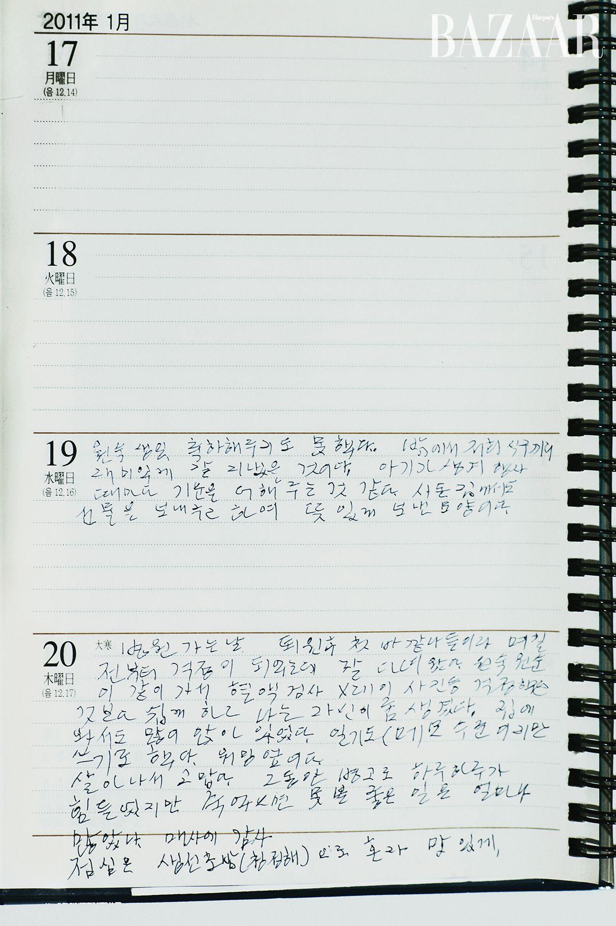 서울대학교 중앙도서관에 기증된 작가 박완서의 생애 마지막 일기. 15년 전인 2011년 1월 20일 타계하기 사흘 전 쓴 일기에 글쓰기와 삶을 향한 사랑과 특유의 유머가 드러난다. “일기도 메모 수준이지만 쓰기로 했다. 워밍업이다. 살아나서 고맙다. 그동안 병고로 하루하루가 힘들었지만 죽었으면 못 볼 좋은 일은 얼마나 많았나. 매사에 감사. 점심은 생선초밥으로 혼자 맛있게.”