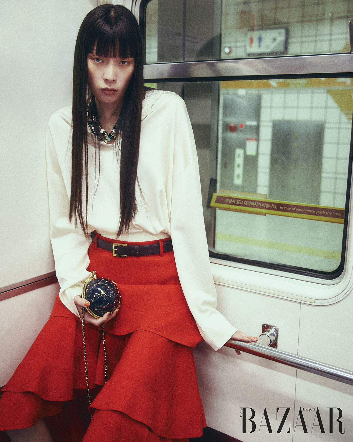 톱, 스커트, 니트 브리프, 레이어드한 메탈 소재 목걸이, 벨트, 지구본 모티프 이브닝 백은 모두 Chanel.