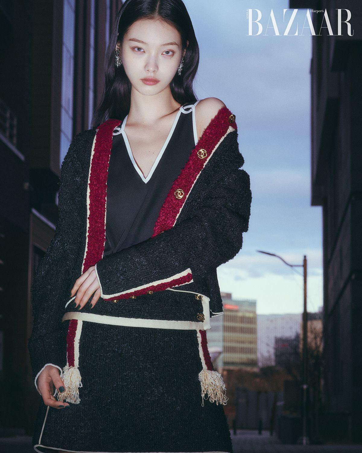 재킷, 슬리브리스 톱, 스커트, 귀고리는 모두 Chanel.