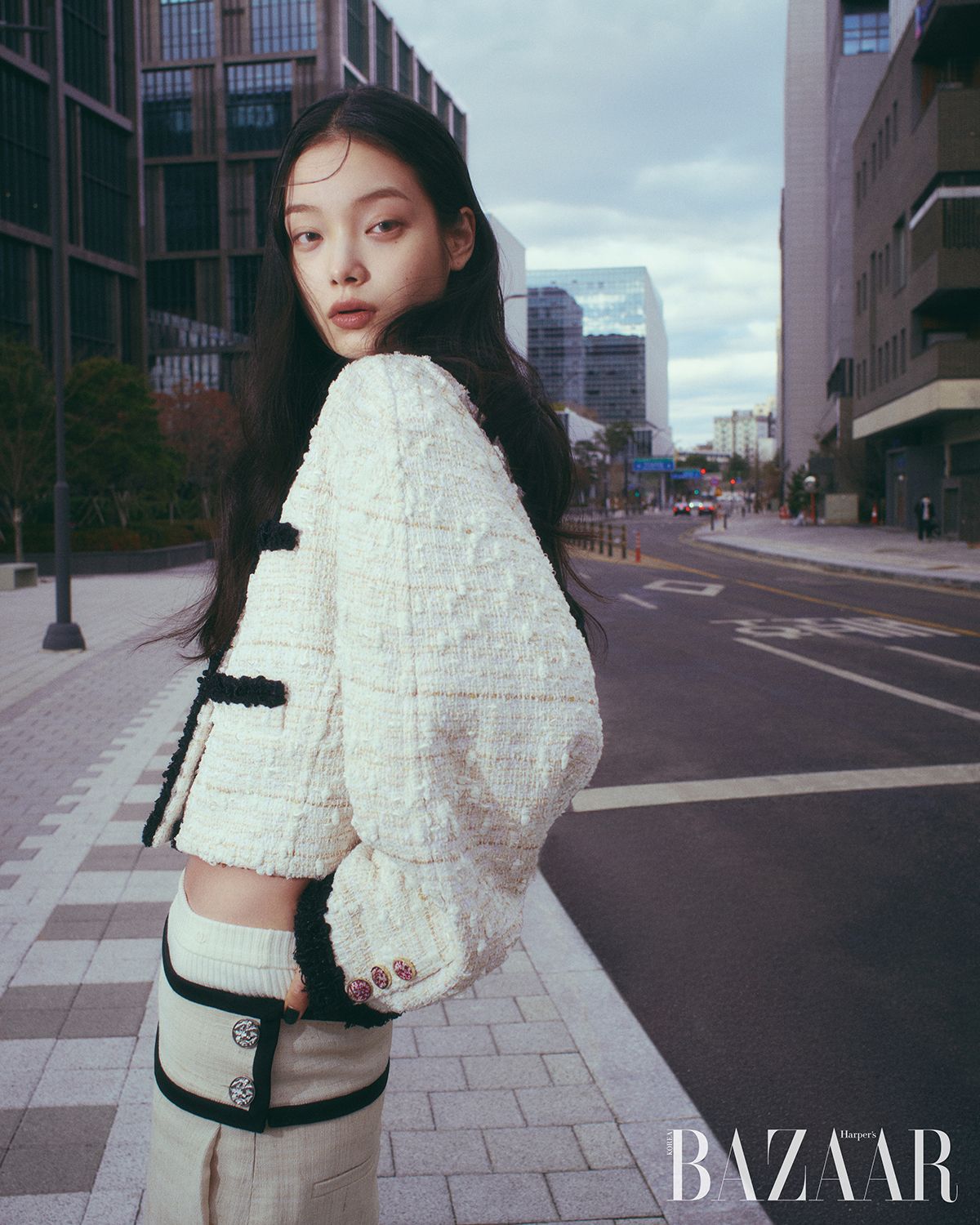 트위드 재킷, 드레스는 Chanel.