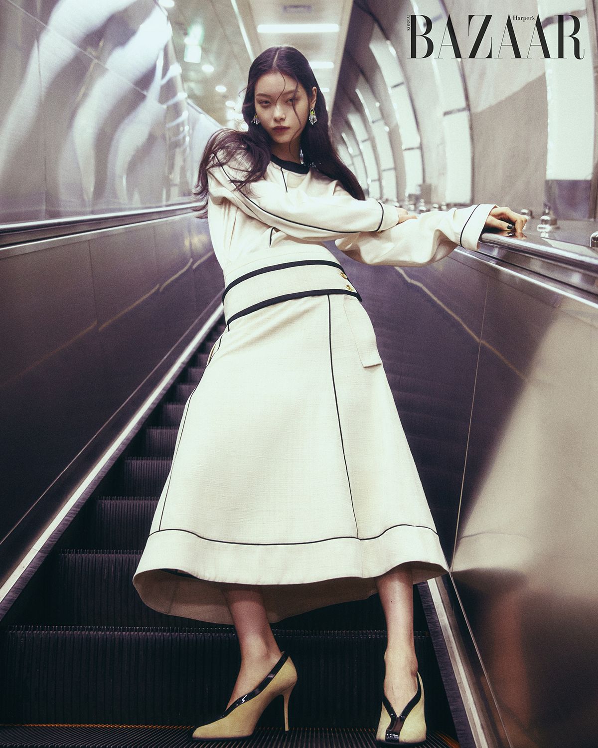 재킷, 톱, 팬츠, 니트 브리프, 레이어드한 메탈 소재 목걸이, 벨트, 펌프스 힐은 모두 Chanel.