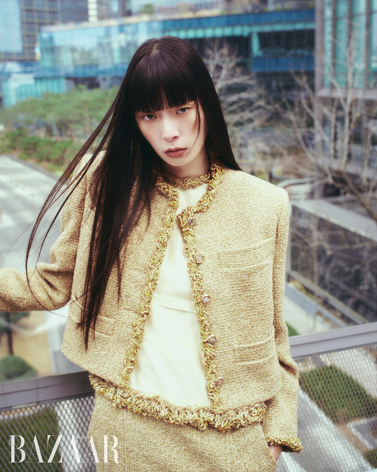 트위드 재킷, 스커트, 니트 브리프는 모두 Chanel.