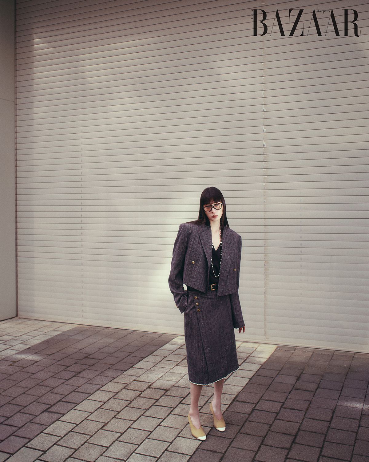 재킷, 톱, 스커트, 안경, 목걸이, 벨트, 펌프스 힐은 모두 Chanel.