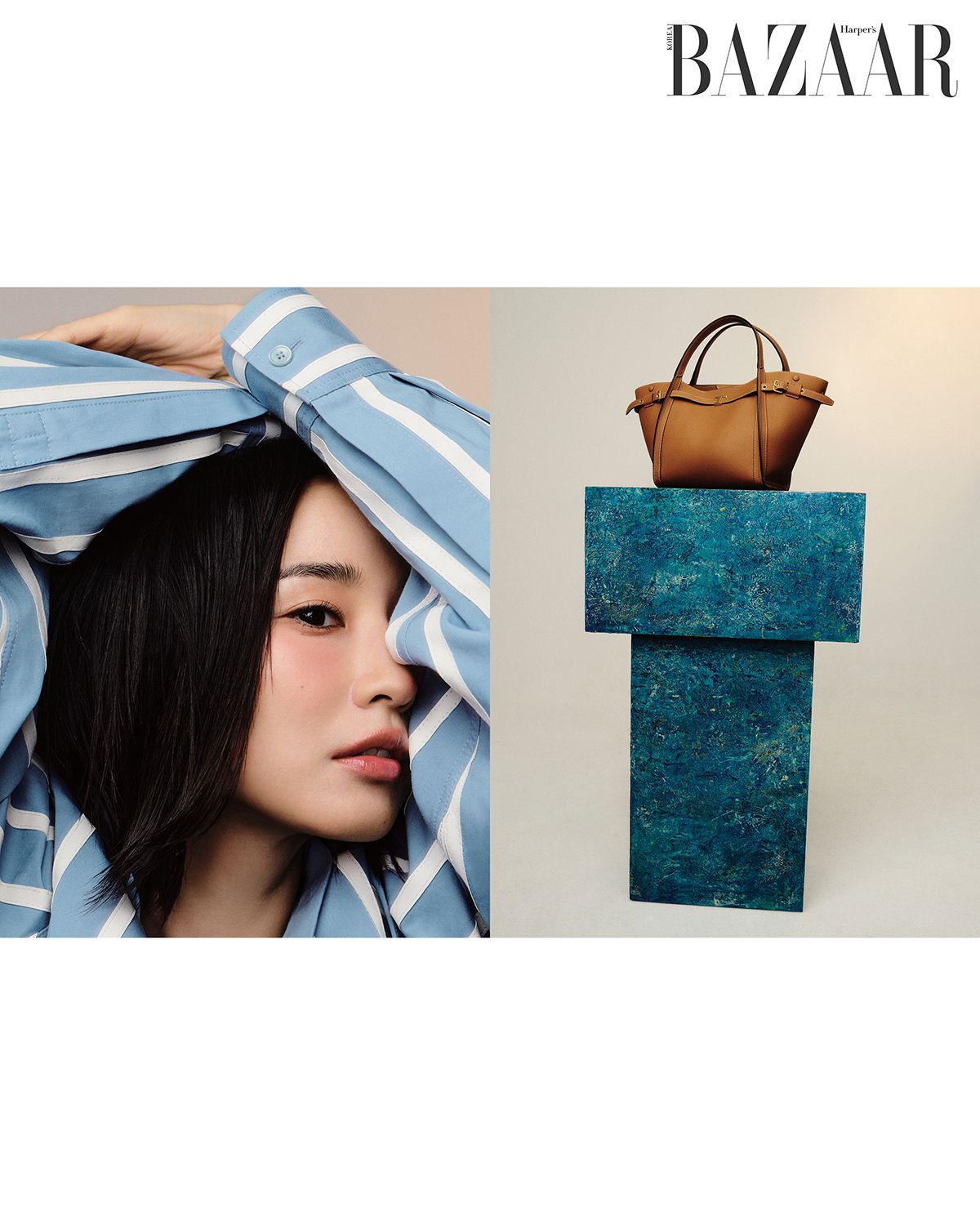 스트라이프 패턴의 레더 셔츠는 5백85만원, ‘T 타임리스’ 쇼퍼 백은 3백9만원 Tod’s.