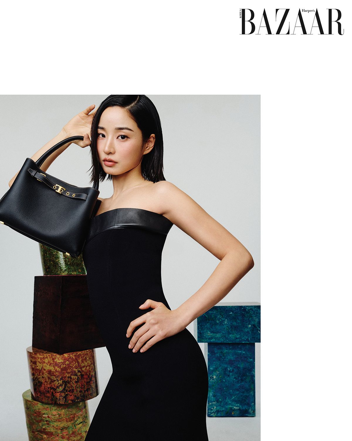 오프숄더 드레스는 4백80만원, ‘T 타임리스’ 톱 핸들 백은 3백52만원, 슬링백 펌프스는 1백36만원 모두 Tod’s.