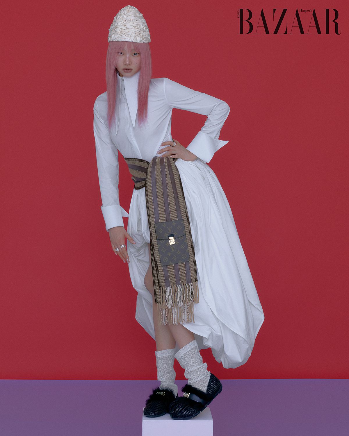 하이넥 셔츠, 언밸런스 벌룬 스커트, 허리에 두른 머플러, 플로럴 삭스, 플랫 뮬은 모두 Louis Vuitton. 모자는 Loro Piana. 반지는 모두 Messika.