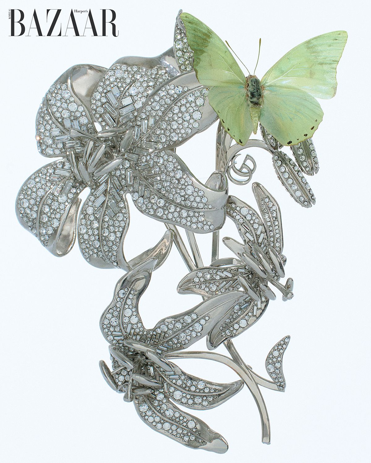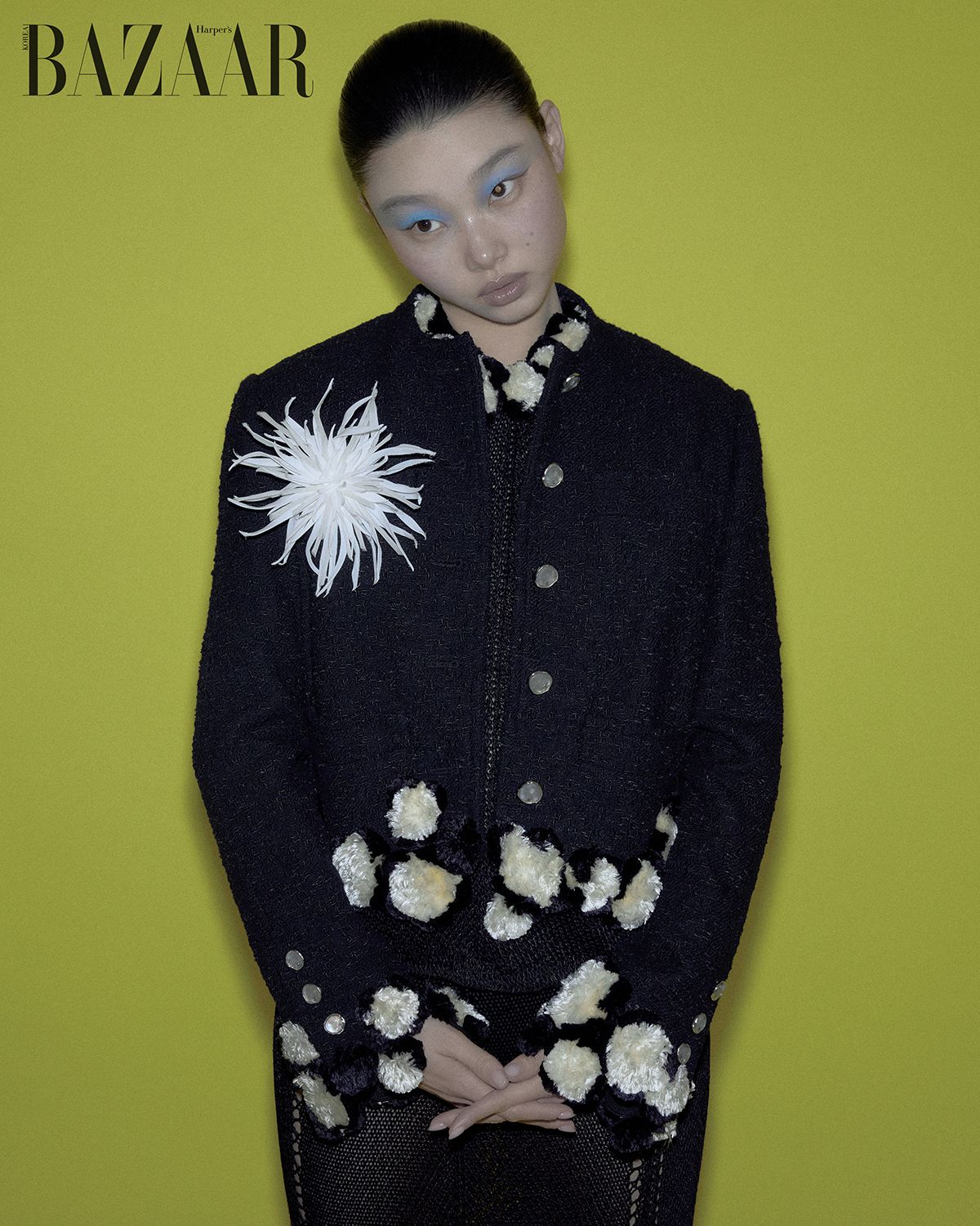 재킷, 톱, 스커트, 꽃 모티프 브로치는 모두 Chanel.