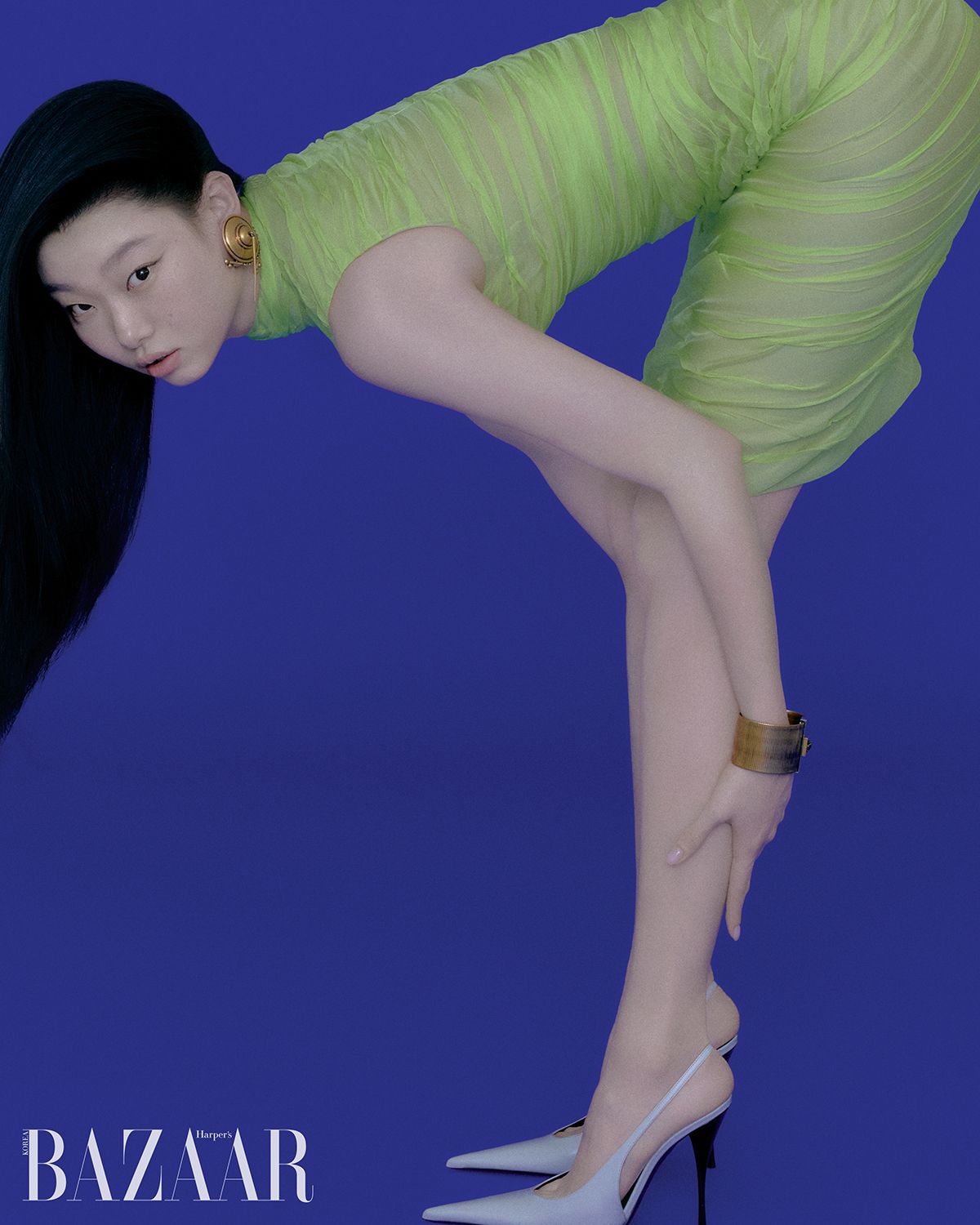 실크 시폰 드레이프 드레스, 귀고리, 팔찌는 모두 Versace. 슬링백 펌프스는 Saint Laurent by Anthony Vaccarello.