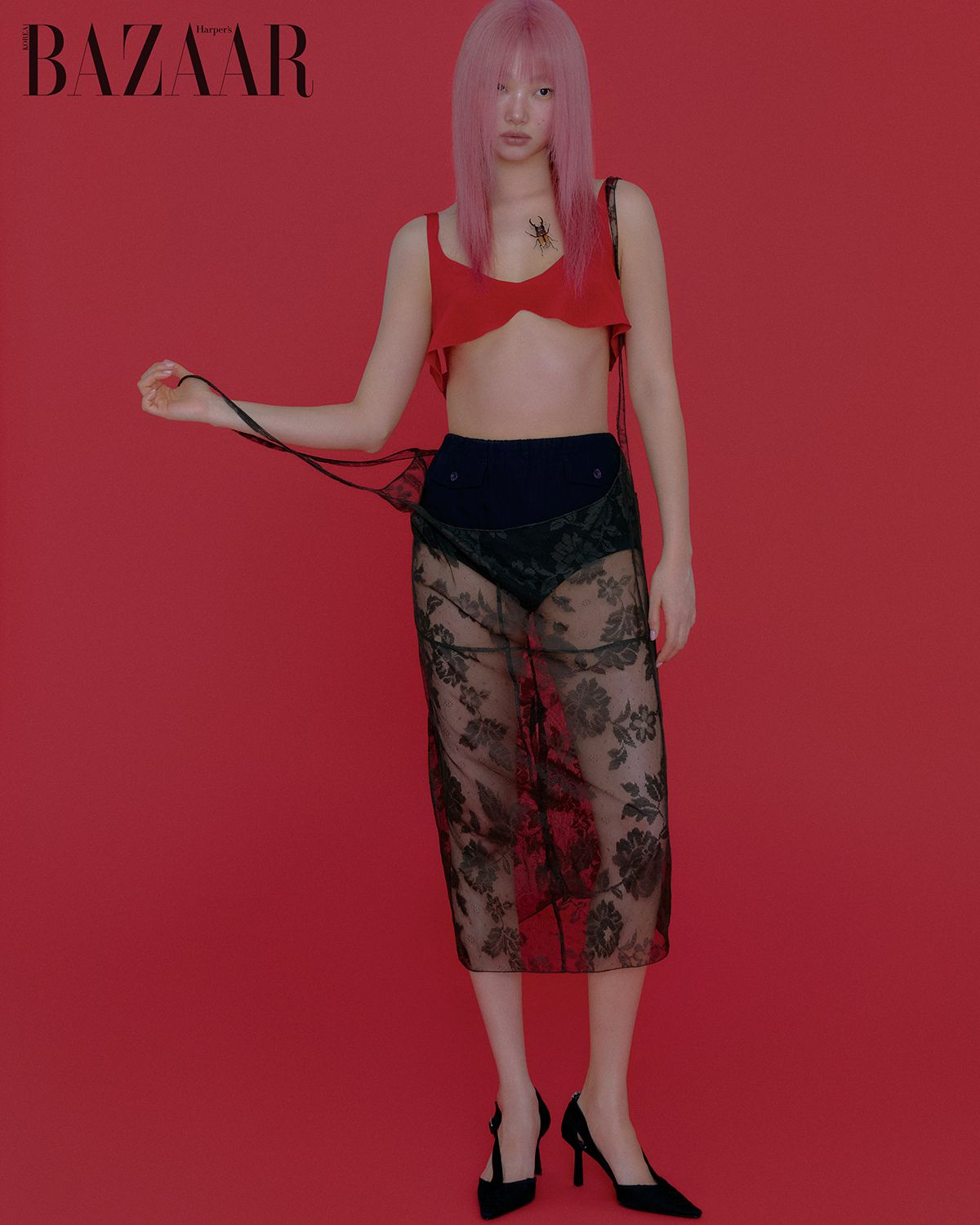 브라톱, 서스펜더 스커트, 브리프, 펌프스는 모두 Prada.