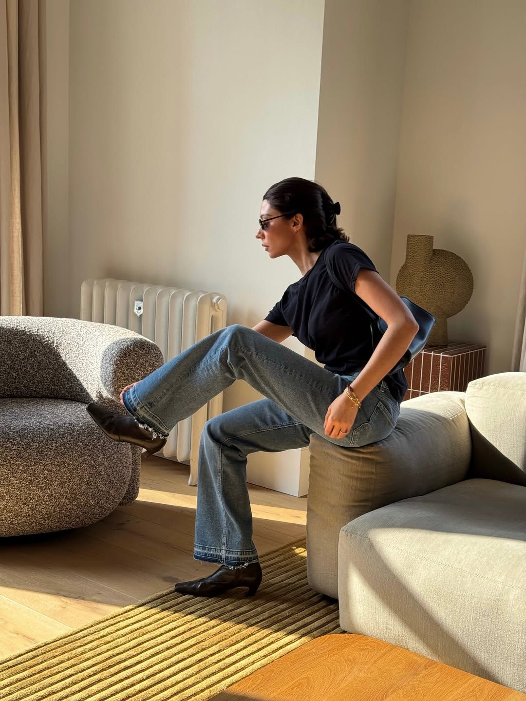 다리 라인을 길고 슬림하게 보이고 싶다면, 무릎 아래에서 확실하게 퍼지는 플레어에 가까운 부츠컷을 시도해보자. 허벅지부터 무릎까지 슬림하게 잡고 하단에서 급격히 확장되며 다리 선을 길게 끌어내리는 디자인의 데님을 선택하면 된다. 채도가 낮은 다크 컬러는 시선을 분산시키지 않고 다리 라인을 하나로 이어주어, 퍼지는 형태를 선명하게 드러낸다. 특히 힐과 연결될 때 밑단의 확장감이 이어져 다리 길이를 극대화하는 것이 포인트다. 상의는 다크한 컬러의 계절감에 맞춰 부드러운 니트나 레더 아우터처럼 밀도 있는 소재로 정리하면 안정적이다. 상의를 바지 안으로 넣거나 벨트로 허리선을 드러내어 줄수록 전체 실루엣의 완성도를 높일 수 있다.