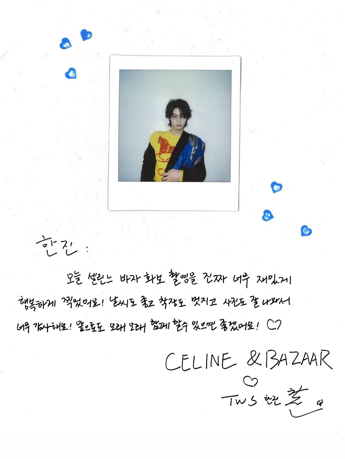 오늘 셀린느 바자 화보 촬영을 진짜 너무 재밌게 행복하게 찍었어요! 날씨도 좋고 착장도 멋지고 사진도 잘 나와서 너무 감사해요! 앞으로도 오래오래 함께 할 수 있으면 좋겠어요! ♡ CELINE & BAZAAR ♡ -한진-