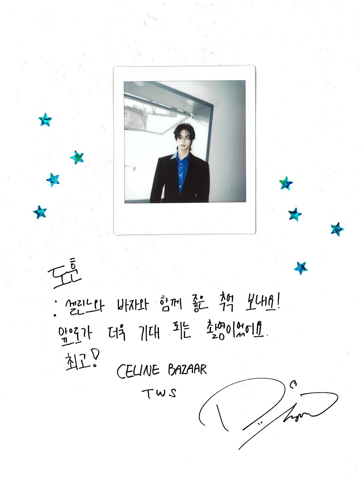바자 4월호 디지털 커버는 셀린느와 TWS가 장식했다. 신유, 도훈, 영재, 한진, 지훈, 경민은 바자와 함께한 화보 현장에서 특별한 폴라로이드 사진을 남기고, 촬영을 마친 소감을 전했다. 오직 바자 웹사이트에서만 공개되는 익스클루시브 사진과 멤버들의 손편지는 아래에서 확인해 볼 것.