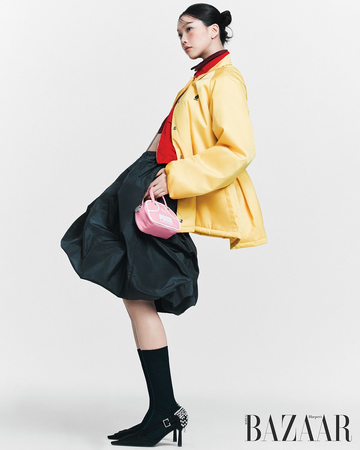 블루종 재킷, 벌룬 스커트, 크리스털 장식 펌프스는 모두 Prada. 레드 재킷은 Moncler Grenoble. 레이어드한 크롭트 트랙 재킷, 미니 볼링 백은 Puma. 양말은 Loro Piana.