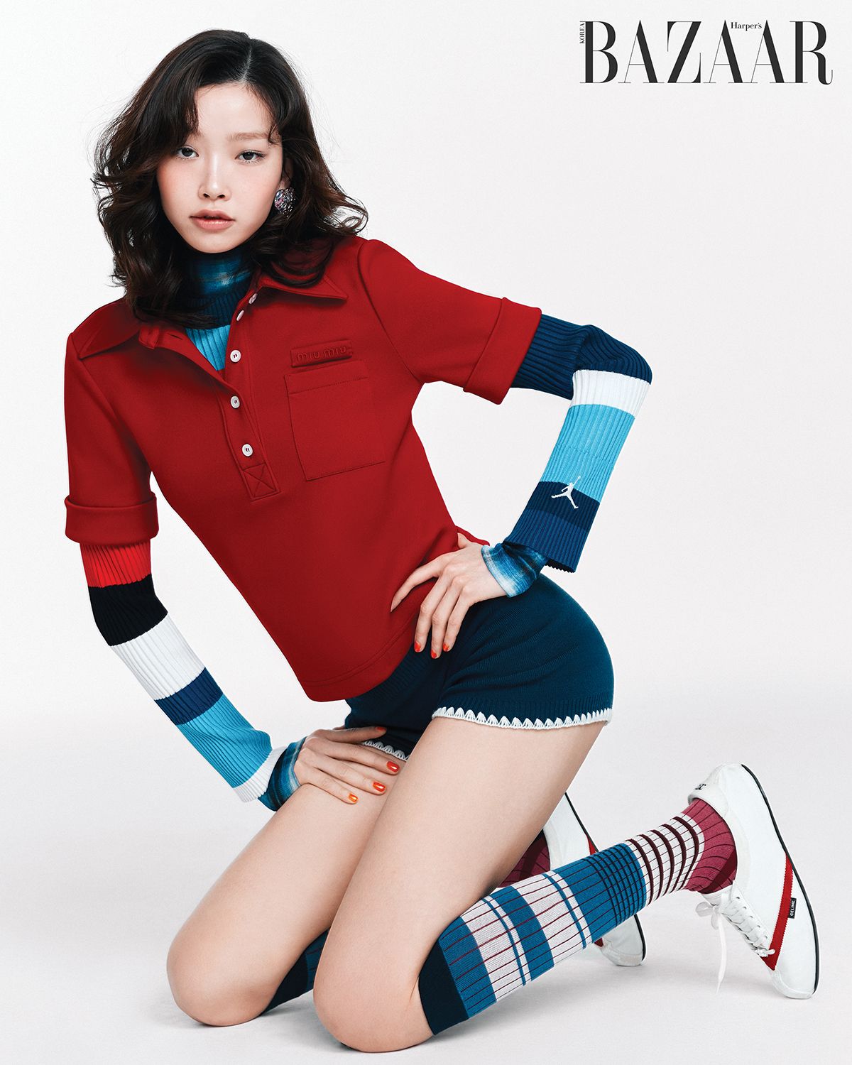 폴로셔츠는 Miu Miu. 스트라이프 스웨터는 Nike. 이너로 착용한 체크 터틀넥은 Cos. 니트 쇼츠는 Jac Fleurant. 하트 모티프 귀고리는 Self-Portrait. 스니커즈는 Celine. 양말은 에디터 소장품.
