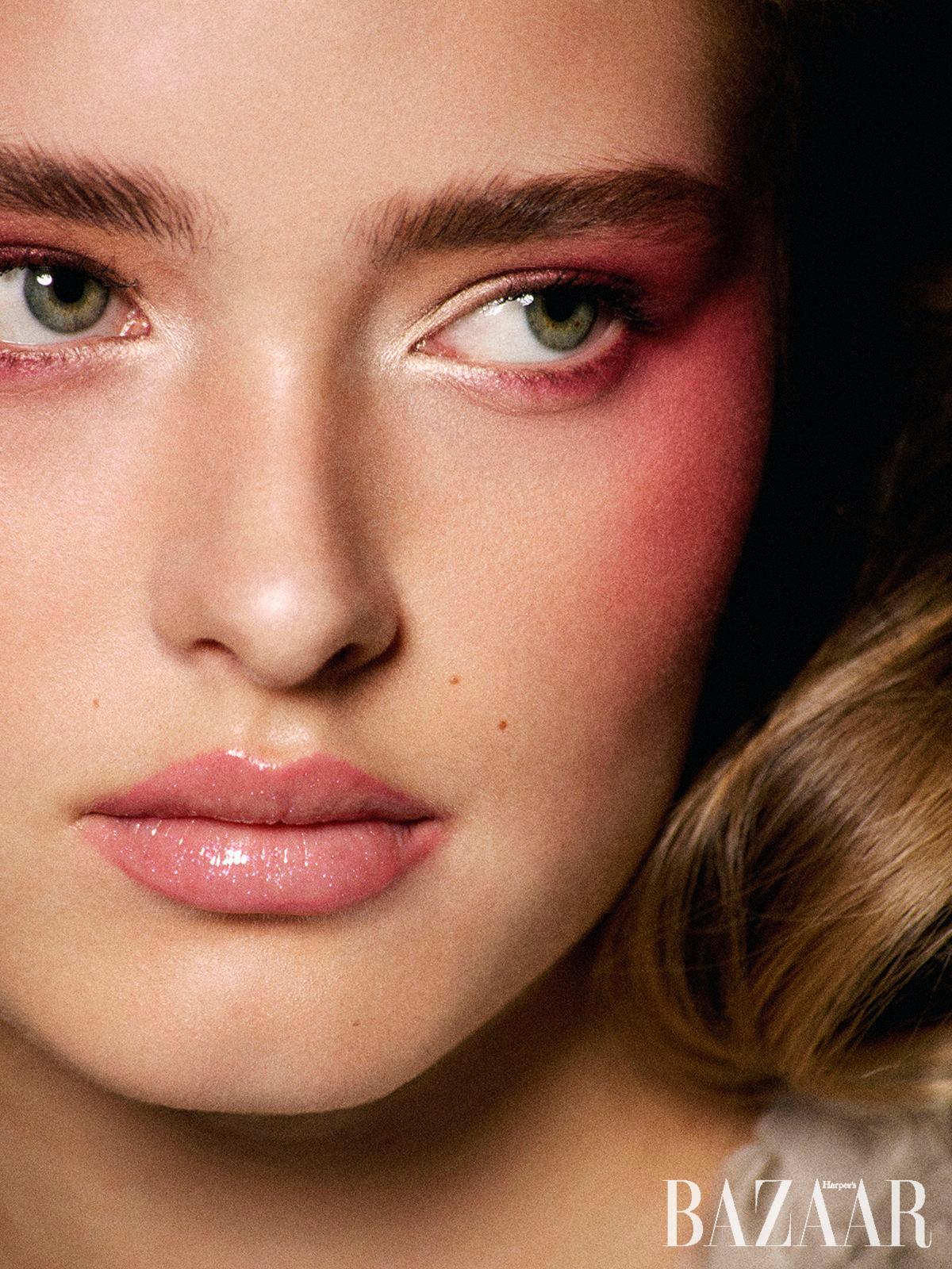 몇 시즌 전부터 블러셔는 메이크업의 분위기를 좌우하는 핵심 요소가 되었다. 이제 컬러보다 중요한 것은 어디에 색을 얹느냐다. 모델은 보습 프라이머와 파운데이션으로 피부에 자연스러운 윤기를 더하고, 실키한 파우더 블러셔를 광대뼈에서 관자놀이까지 이어지게 블렌딩했다. 이는 얼굴을 리프트해 보이도록 한다.