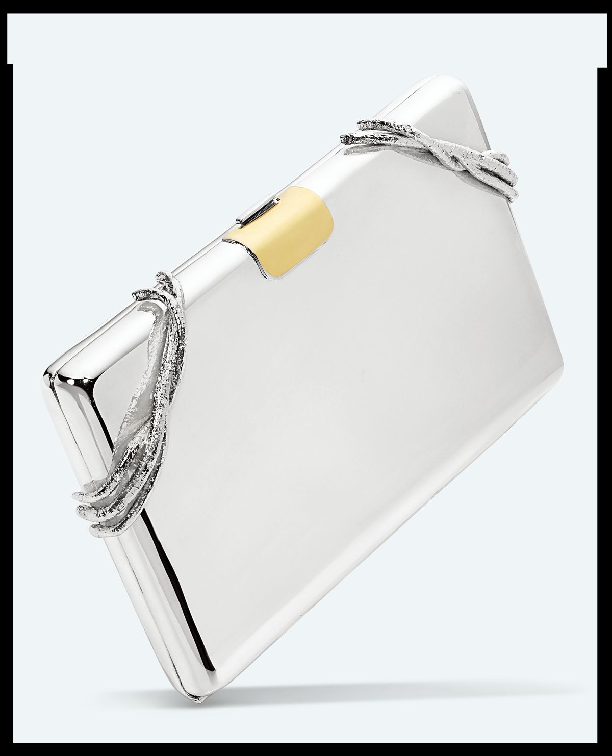 조형적인 화이트 골드 스퀘어 쉐입의 클러치 백은 Ana Khouri.
