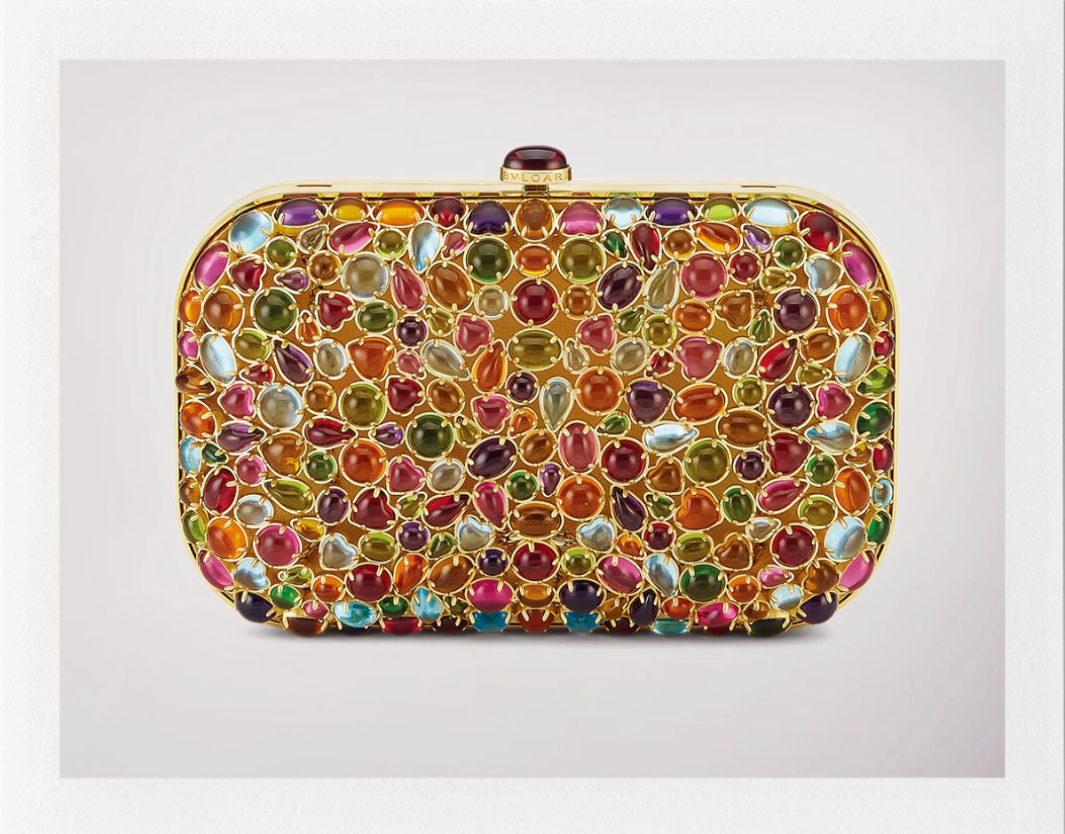 젬스톤이 빼곡하게 세팅된 화려한 주얼 클러치 백은 Bvlgari.