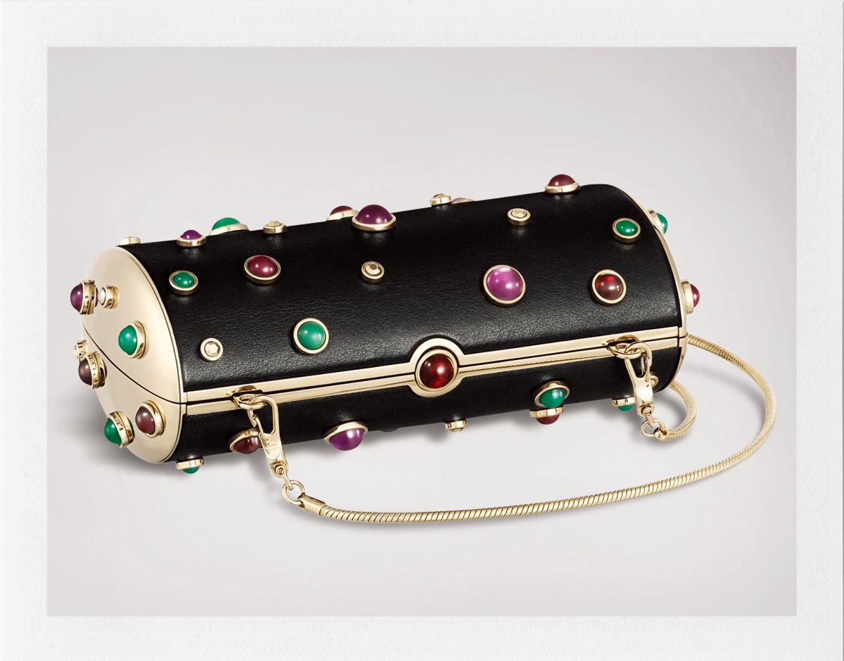 그린 오닉스와 헤소나이트 가닛, 바이올렛 애미시스트 등이 장식된 ‘카보숑’ 백은 Cartier.