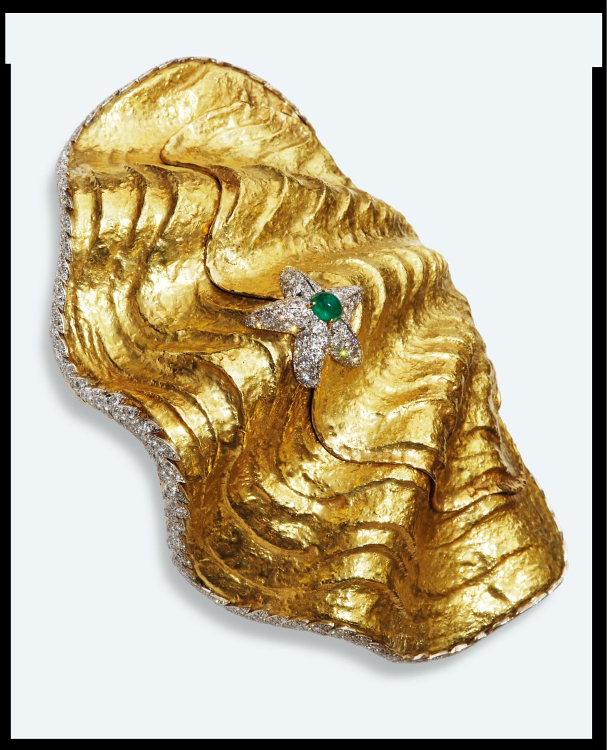 조개 껍데기 모티프의 옐로 골드 주얼 클러치 백은 David Webb.
