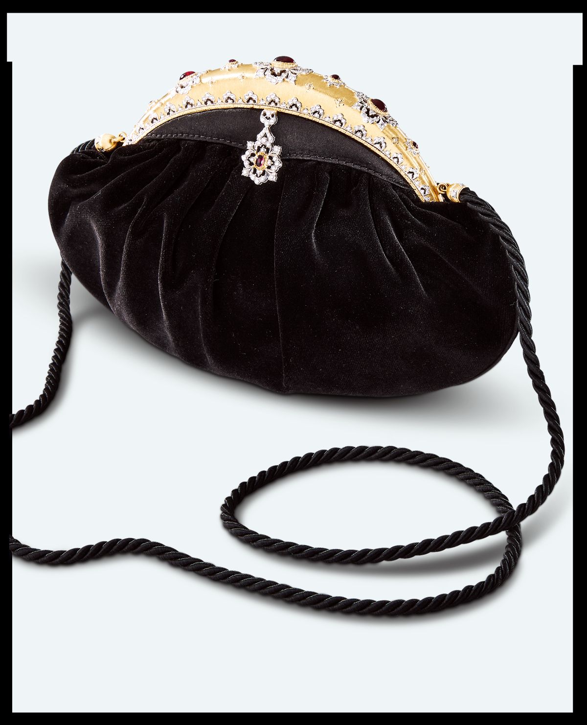 옐로 골드 주얼 버클과 블랙 실크 백이 어우러진 클러치 백은 Buccellati.